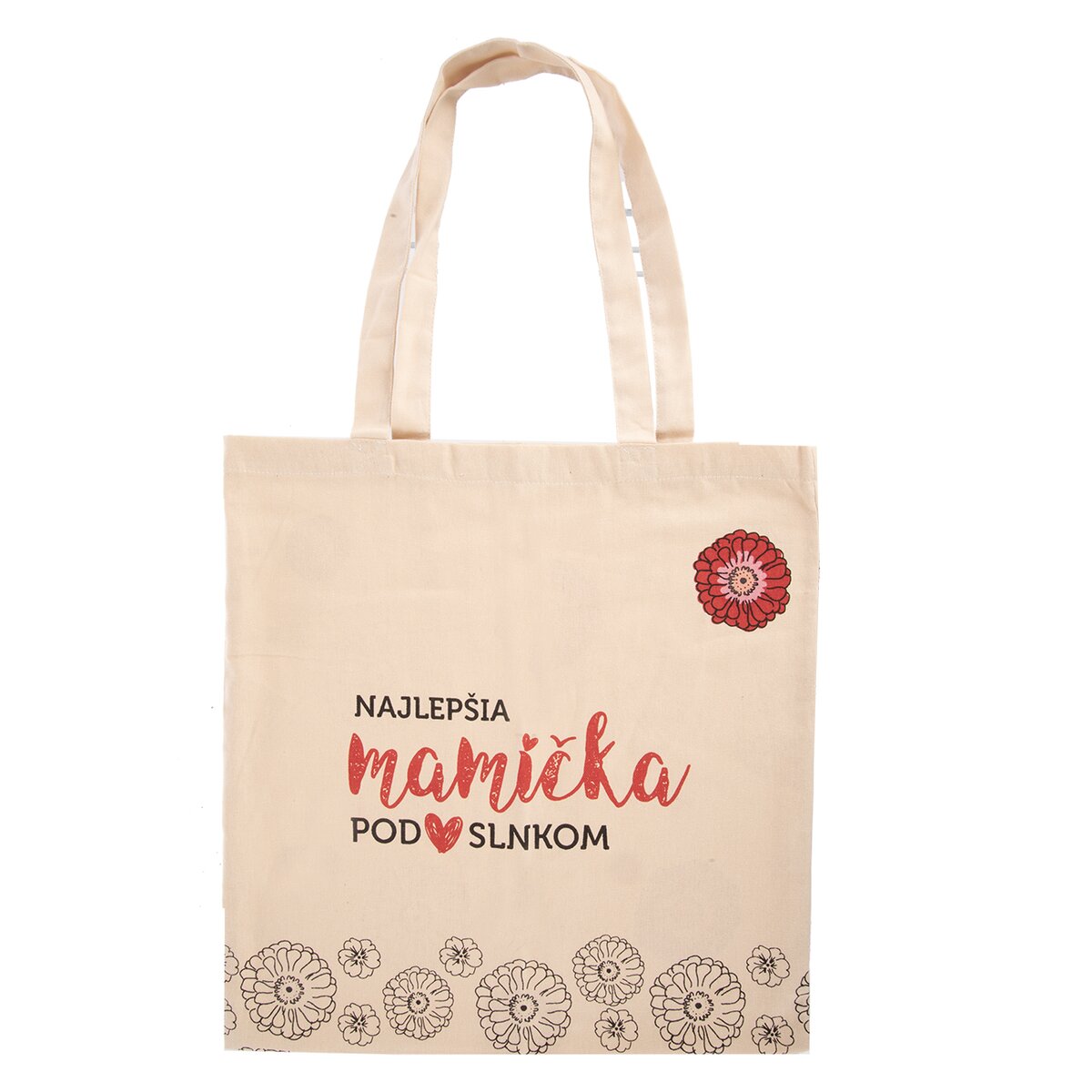 Kód produktu 731428Bavlnená nákupná taška s rozmermi 39×40 cm, s kvetinovým motívom a nápisom NAJLEPŠIA MAMIČKA POD SLNKOM.