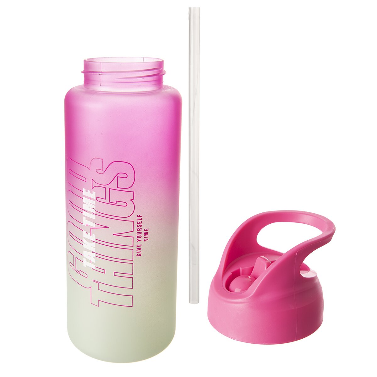 Ružovo-zelená fľaša je vhodná do auta, do práce, do školy aj na šport. Je vybavená praktickým náustkom a držadlom, vhodným na prenášanie.