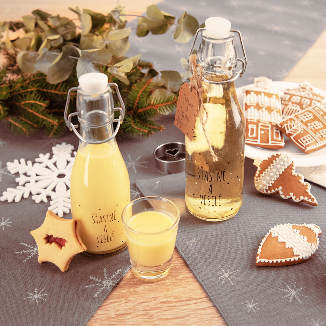 - Fľaše s potlačou „Šťastné a veselé“ – ideálne na domáce likéry, vaječný likér alebo varené víno