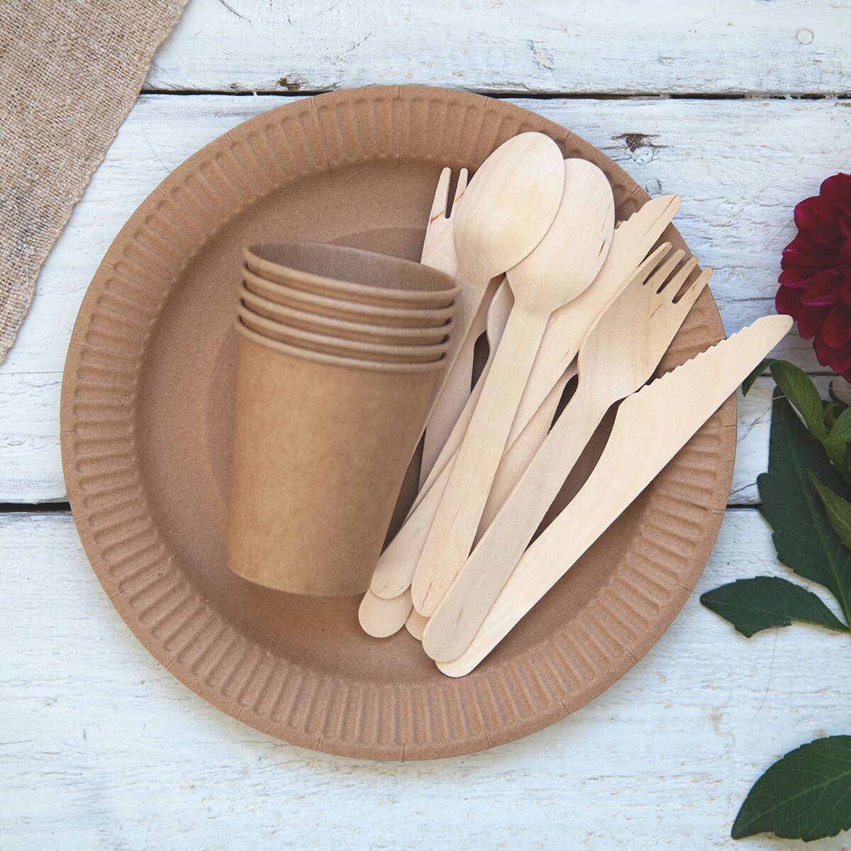 Sada obsahuje 20 ks nožov z brezového dreva dĺžky 16,5 cm, ktoré do pokrmov neuvoľňujú škodlivé látky ako ftaláty alebo BPA. Hodia sa spoločne s vidličkami na záhradnú slávnosť, raut aj verejné podujatia s ochutnávkou.