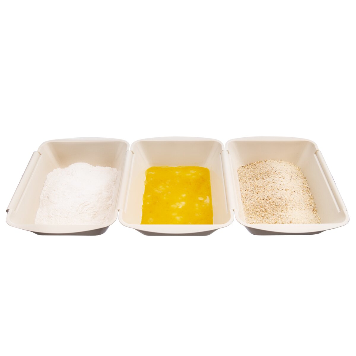 Kód produktu 128372Súprava troch plastových misiek určených na obaľovanie rezňov v trojobale. Každá miska má rozmery 26×20×5,5 cm.