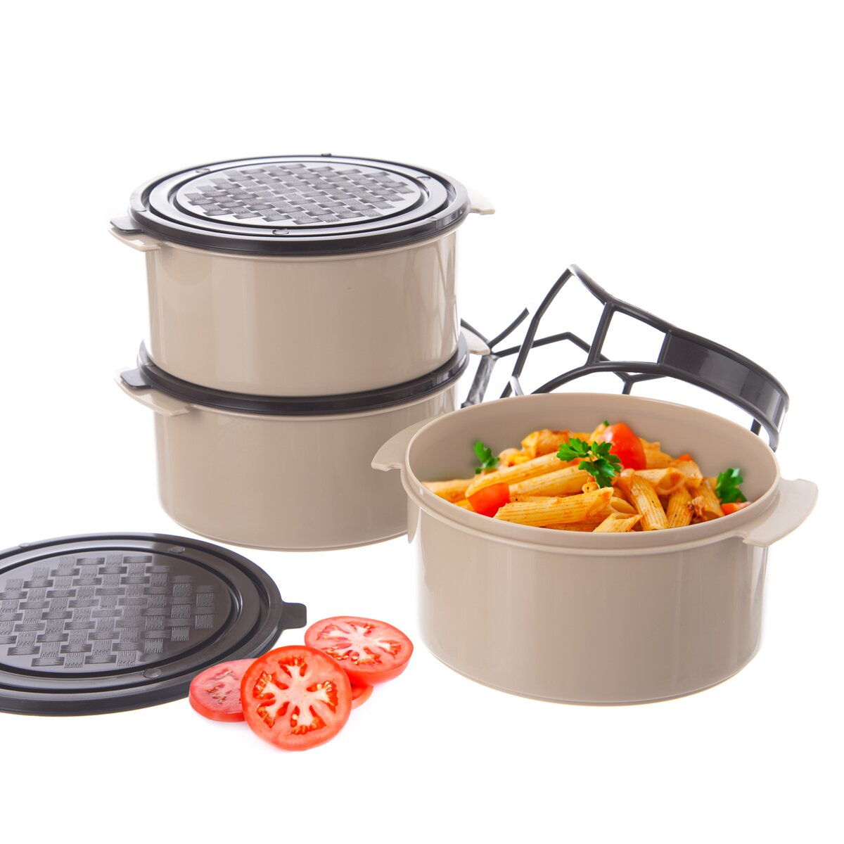 Tvoria ho tri okrúhle misky, z ktorých každá má objem 1,5 l a je opatrená vlastným viečkom. Nádoby sa na seba upevňujú pomocou spony, ktorá zároveň vytvára praktické držadlo na prenášanie.