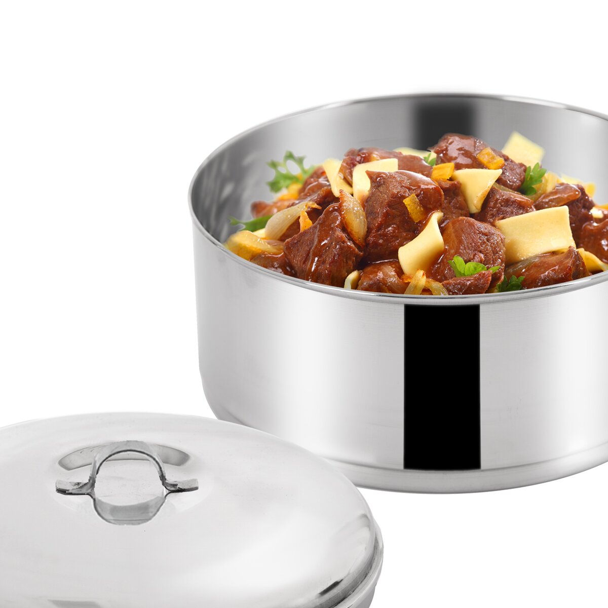 Obsahuje 3 nerezové misky s objemom 1 liter, budú ideálne na uloženie celého menu, polievky, hlavného jedla a šalátu alebo dezertu. Jeho súčasťou je tiež kovový stojan, ktorý umožňuje skladanie nádob na seba a zároveň je opatrený prackou slúžiacou na ich pevné zaistenie.