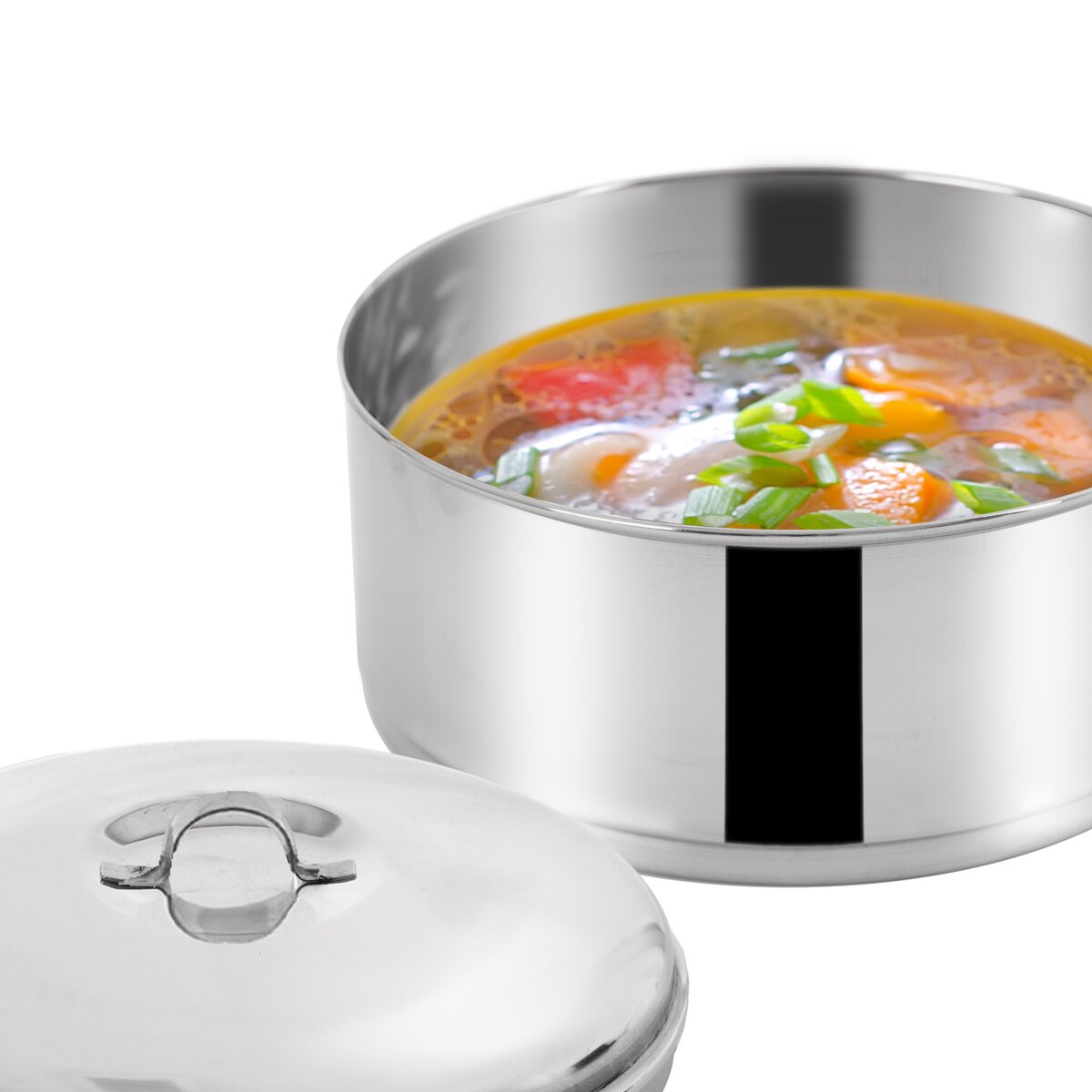 Obsahuje 4 nerezové misky s objemom 1 liter, budú ideálne na uloženie celého menu, polievky, hlavného jedla, samostatnej prílohy a dezertu. Jeho súčasťou je tiež kovový stojan, ktorý umožňuje skladanie nádob na seba a zároveň je opatrený prackou slúžiacou na ich pevné zaistenie.