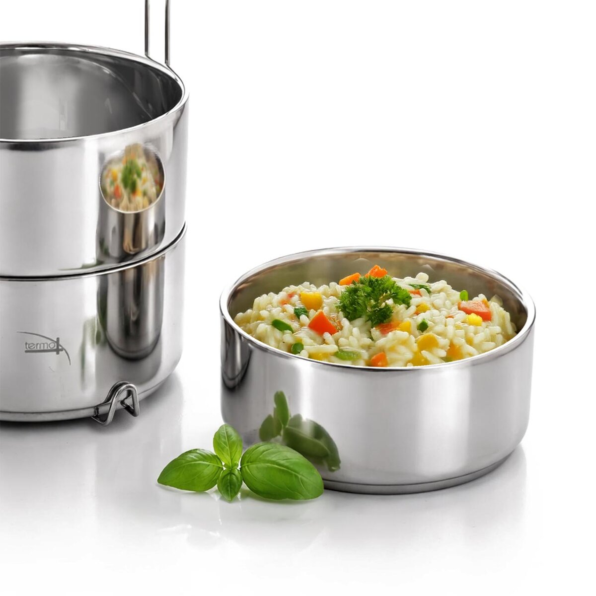 Obsahuje 3 nerezové dvojstenné misky s objemom 0,9 l. Misky sú ideálne na uloženie celého menu, polievky, hlavného jedla a dezertu. Jeho súčasťou je tiež kovový stojan, ktorý umožňuje skladanie nádob na seba a zároveň je opatrený prackou slúžiacou na ich pevné zaistenie.