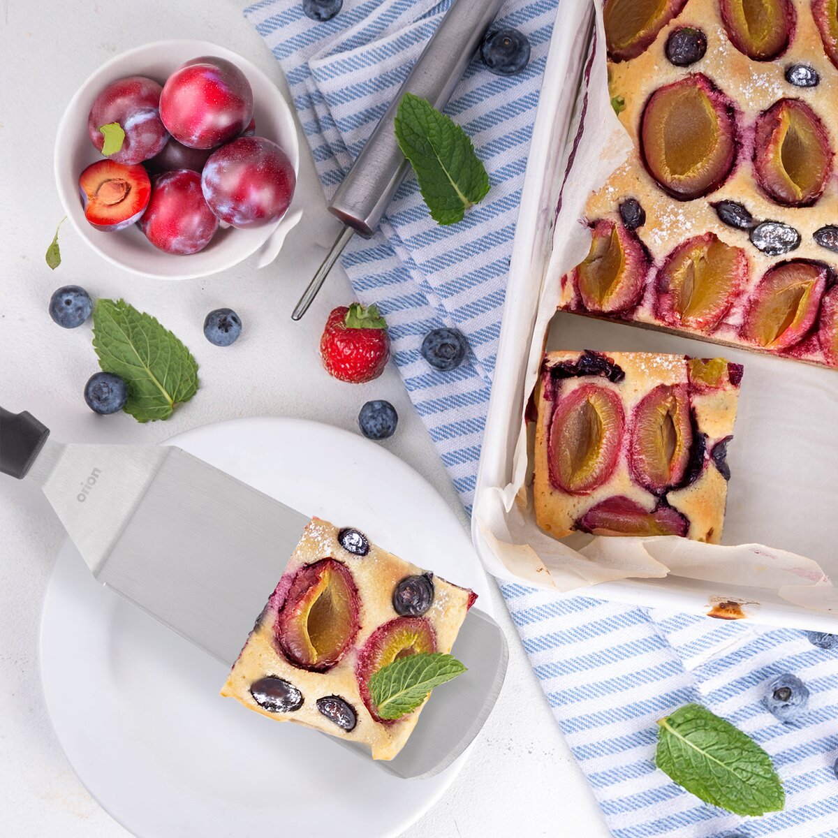 Podoberiete celý kus, ktorý sa udrží v celku a prenesiete ho pohodlne na tanier. Je ideálny na povrchy, ktoré sú tvrdé a odolné voči poškriabaniu. Nepoužívajte ju na riad s nepriľnavým povrchom. Po použití obracačku ľahko umyjete v umývačke.