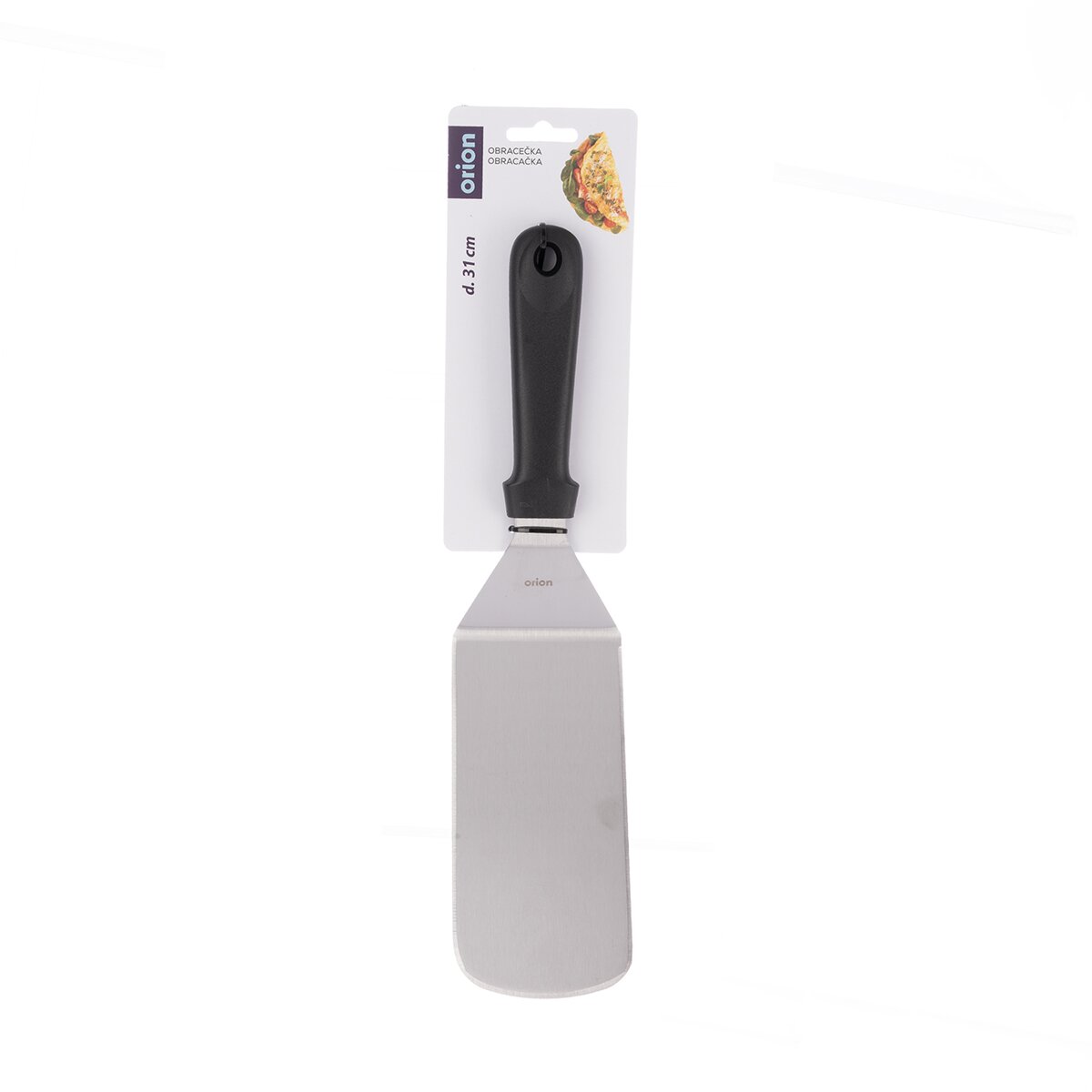 Kód produktu 140359Plochá nerezová obracačka s plastovou rukoväťou s celkovou dĺžkou 33 cm je určená na otáčanie mäsa a rýb pri grilovaní, v kuchyni pri otáčaní fašírok či hamburgerov a servírovaní buchiet, múčnikov alebo lasagní.