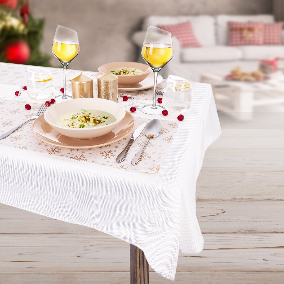 Základom správne prestretého stola je dobre vybraný obrus. Či už ho zháňate na sviatočný obed alebo na bežné stolovanie, vyskúšajte tento biely polyesterový obrus s jemným plastickým dekórom.