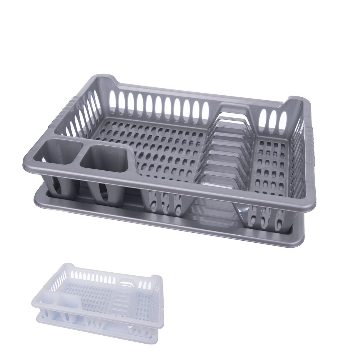 Kód produktu 150669Odkvapkávač na riad s podnosom. Členený - sekcie na príbory, taniere a na ostatné nádoby. Materiál: plast. farebné varianty. Rozmery: 40x29x8,5 cm.