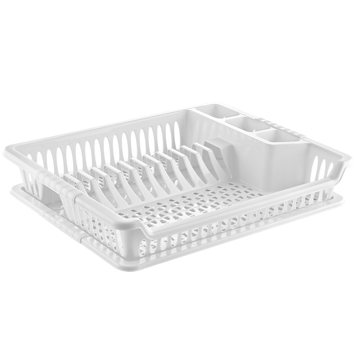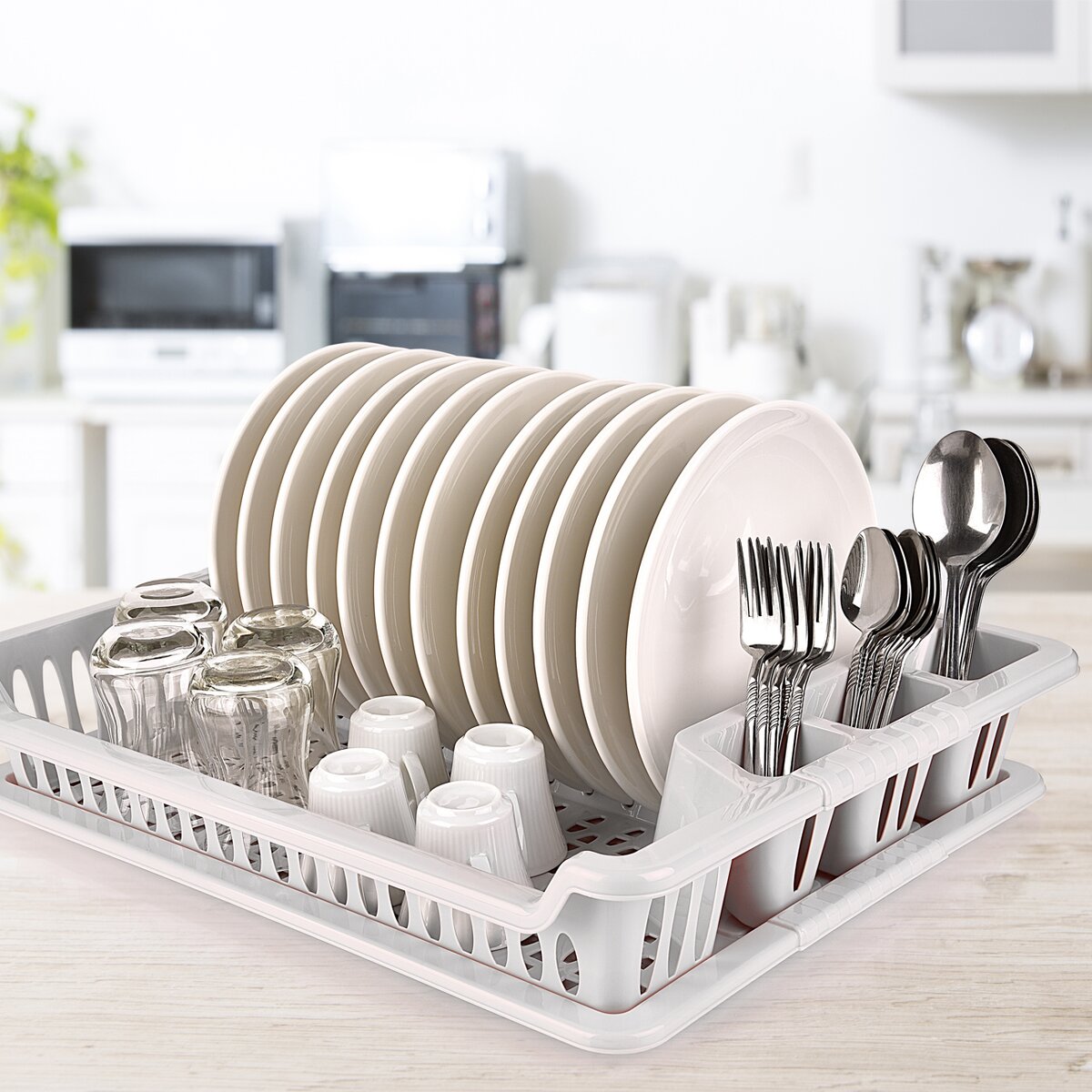 Kód produktu 150696Biely plastový odkvapkávač na riad s táckou. Jeho rozmery sú 45×37×8,5 cm.