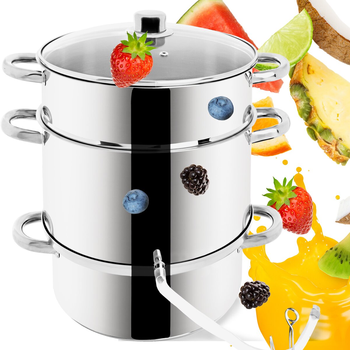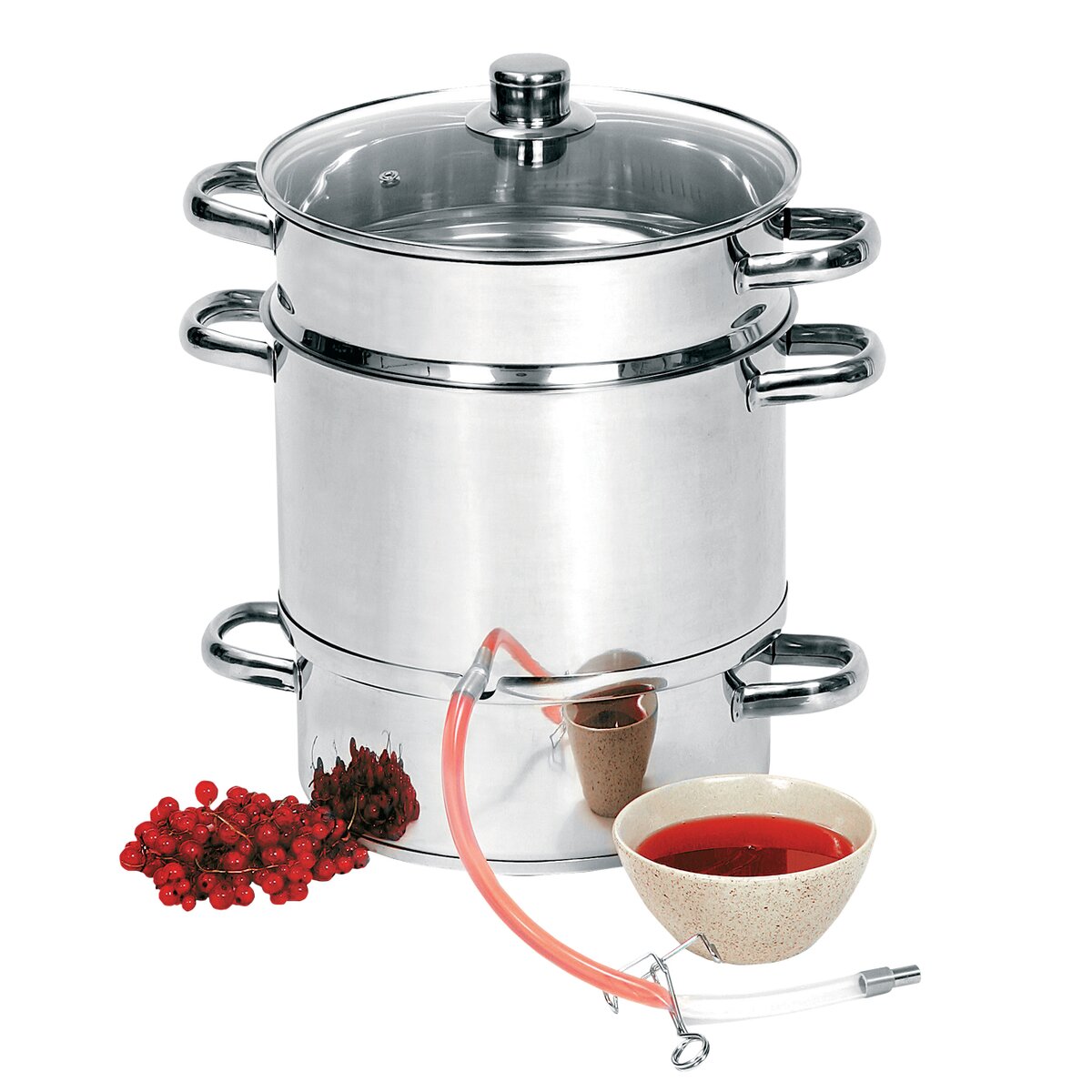 Kód produktu 131421Nerezový odšťavovací hrniec s tromi poschodiami, so sklenenou pokrievkou a vypúšťacou hadičkou.