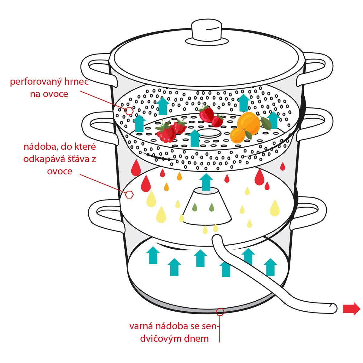 Spodná varná nádoba má sendvičové dno, ktoré efektívne rozvádza teplo a je vhodná aj na indukčné varenie. Naliate voda varom preparuje ovocie, ktoré stačí umyté a prebrané vložiť do hornej nádoby s perforovaným dnom. Šťava sa uvoľňuje do prostredného poschodia, odkiaľ postupne odteká vypúšťacou hadičkou. Tu možno priamo stáčať do fliaš alebo väčšieho hrnca a s cukrom nechať želírovať.