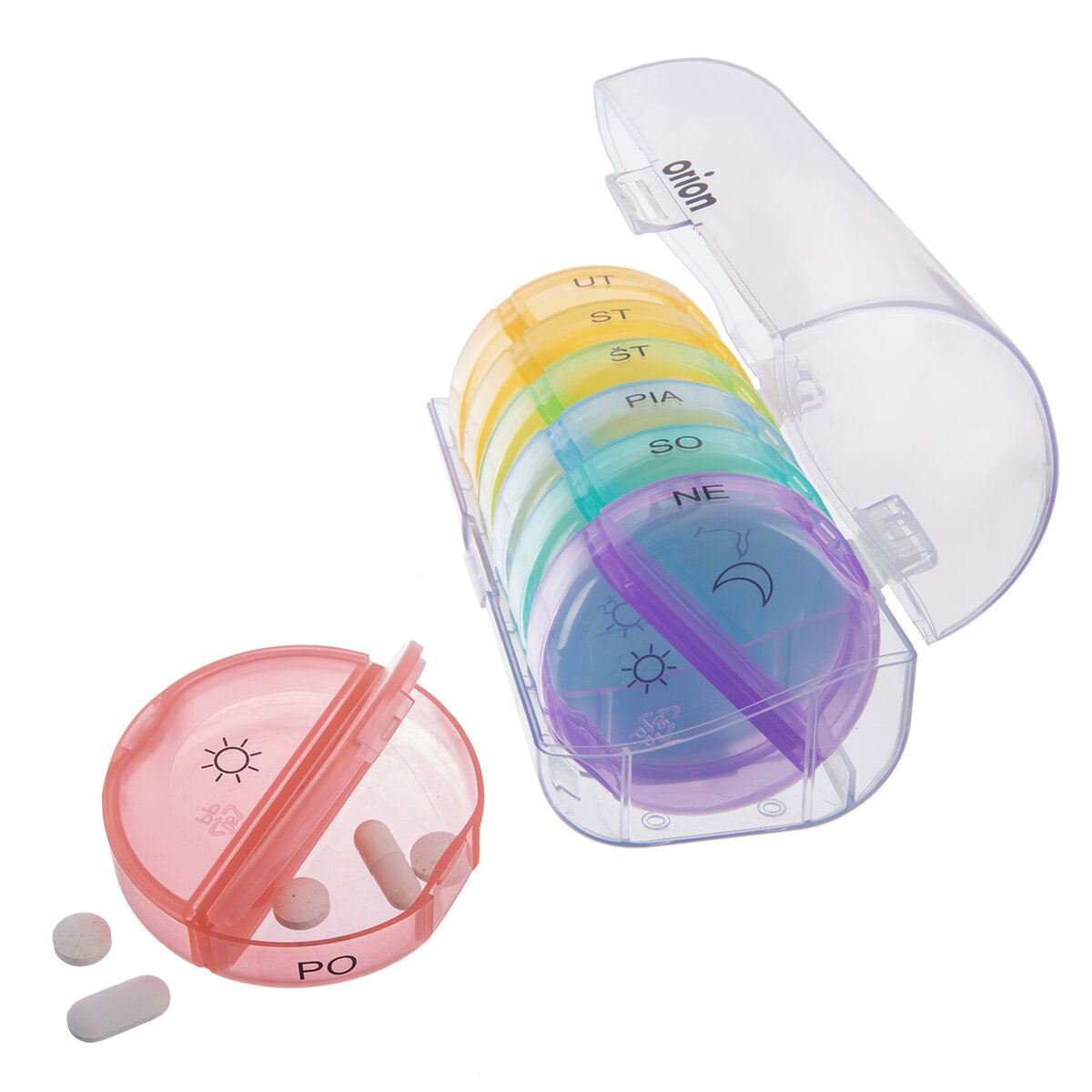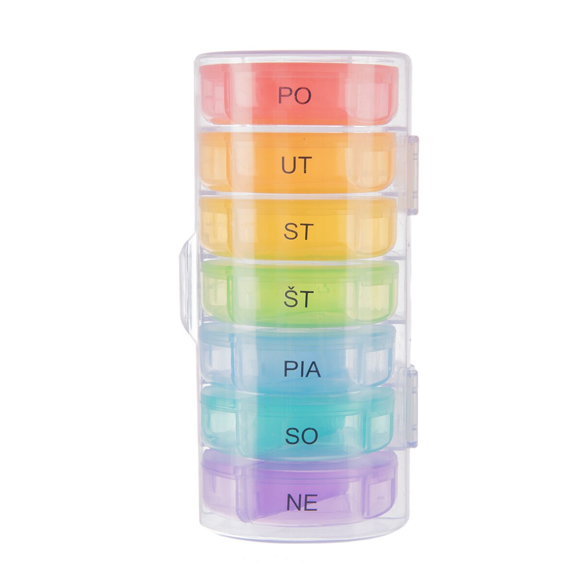 Kód produktu 811269Oblý plastový organizér na uloženie liekov na celý týždeň má vyberateľné dvojdielne sekcie so zatváracími viečkami. Sú rôznofarebné a prehľadne potlačené.