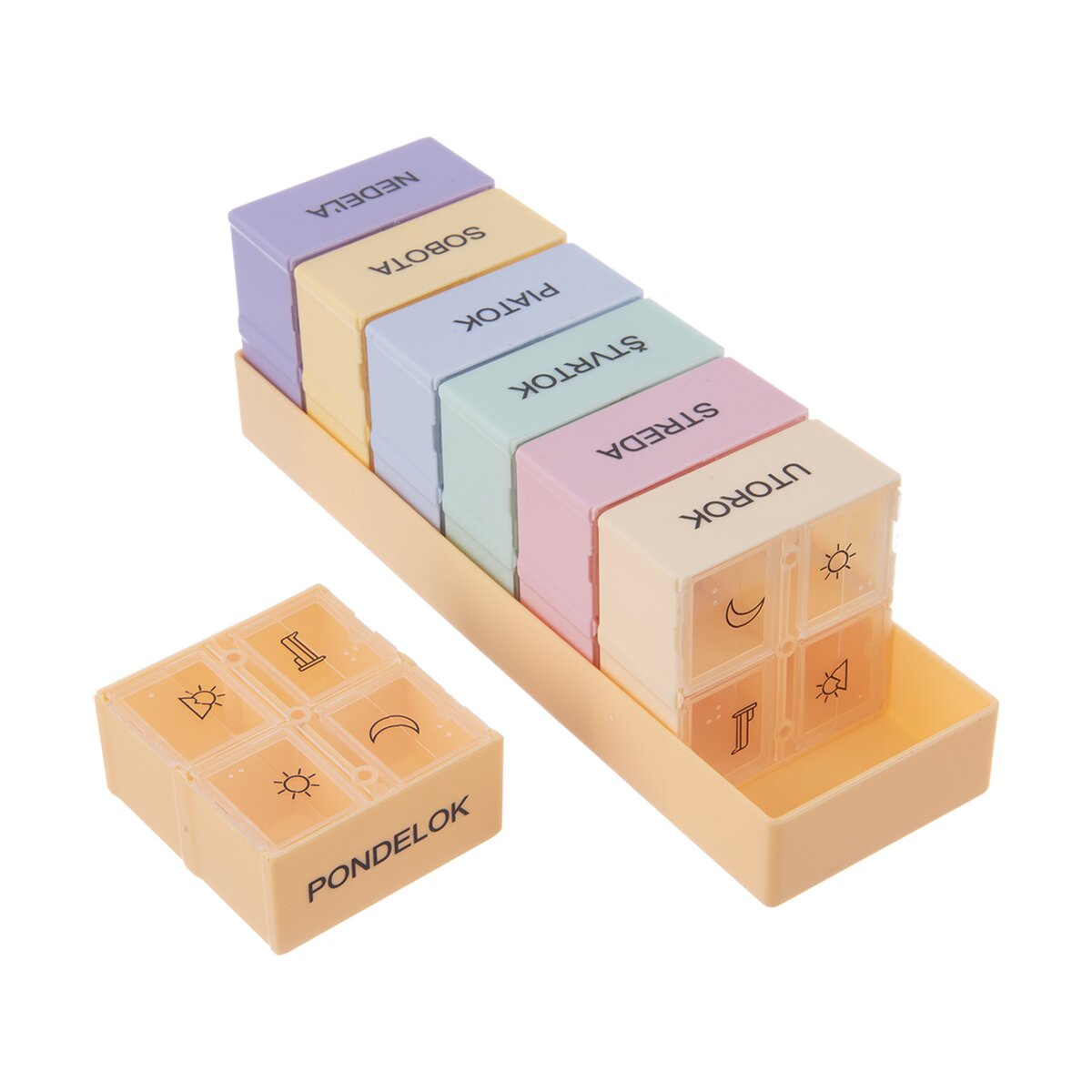 Kód produktu 811265Hranatý plastový organizér na uloženie liekov na celý týždeň má vyberateľné štvordielne sekcie so zatváracími viečkami. Sú rôznofarebné a prehľadne potlačené.