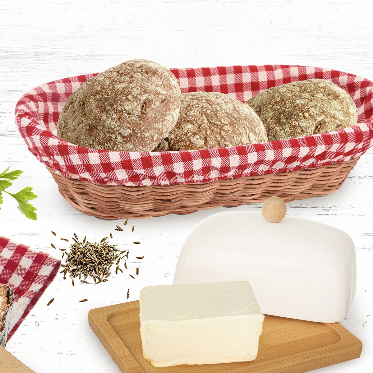 Viac informáciíV krásnej ratanovej ošatke s kockovanou alebo svetlou jednofarebnou látkou zo 100% bavlny budú výborne vyzerať voňavé žemličky, domáci chlieb, ale aj orechy alebo čerstvo nazbierané ovocie zo záhradky, na ktorom si pochutnáte doma či na terase.