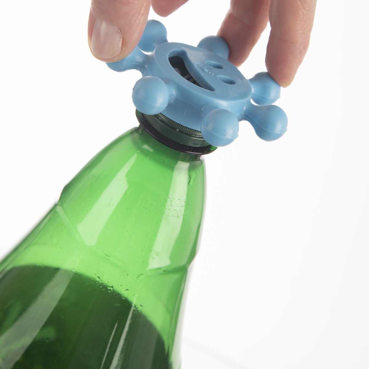 Veselé slniečko, ktoré uľahčí otváranie PET fliaš. Tento farebný plastový otvárač z čistého PS na rozdiel od malých uzáverov plastových flašiek skvele padne do ruky.