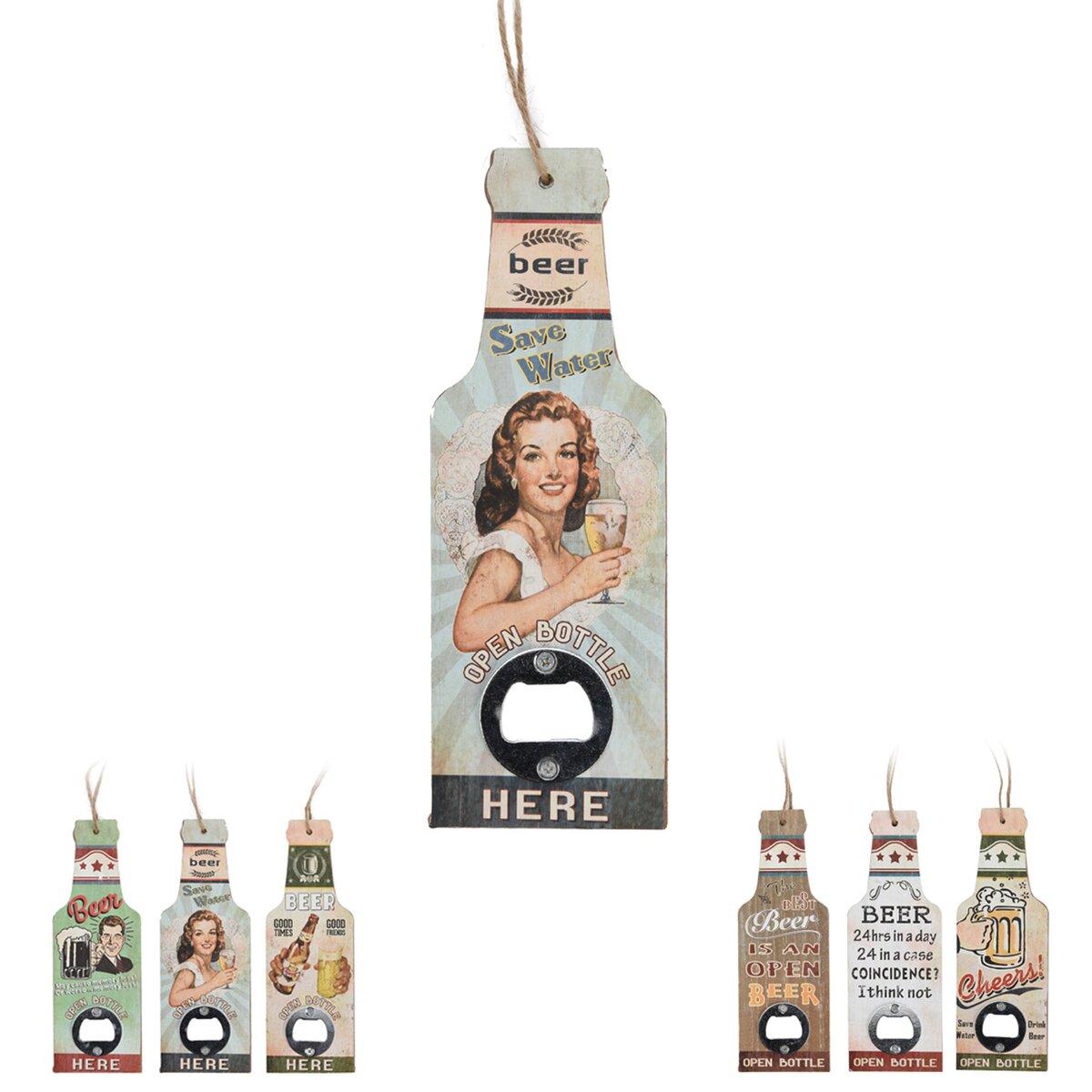 Kód produktu 140878Otvárač na korunkové uzávery v retro štýle. Možnosť zavesenia. Assort dekorov. Materiál: drevo (preglejka), kov. Rozmery: 20x7x1 cm.