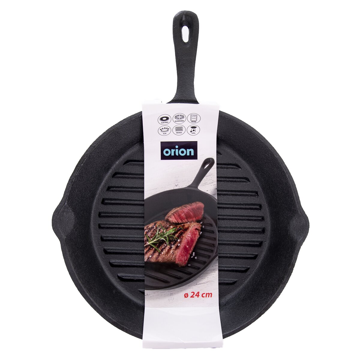 Kód produktu 112987Masívna liatinová grilovacia panvica priemer 24 cm, s typickou rebrovanou štruktúrou, pre intenzívne i pozvoľné opekanie steakov, zeleniny a ďalších obľúbených pokrmov na všetkých typoch sporákov, v rúre aj na grile.