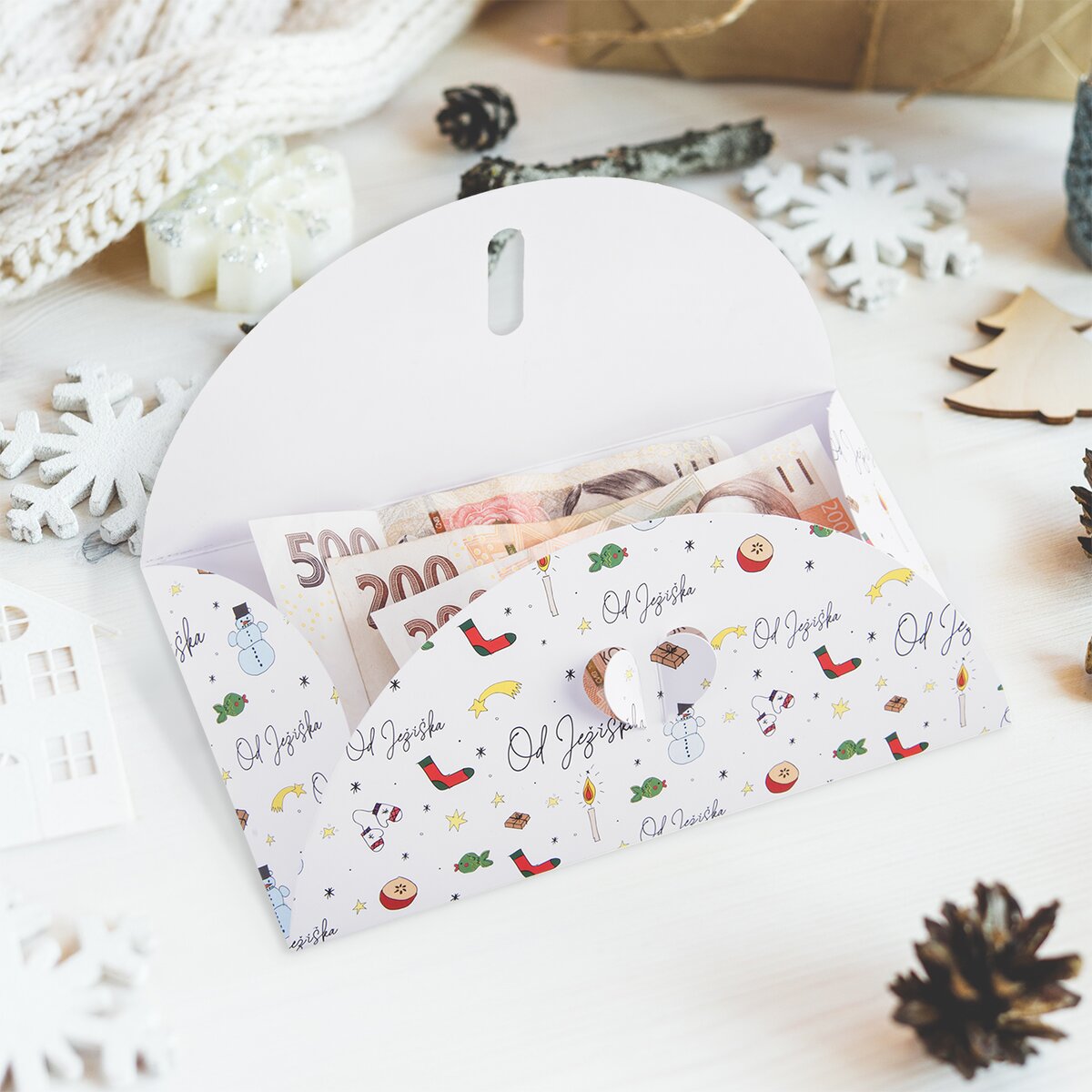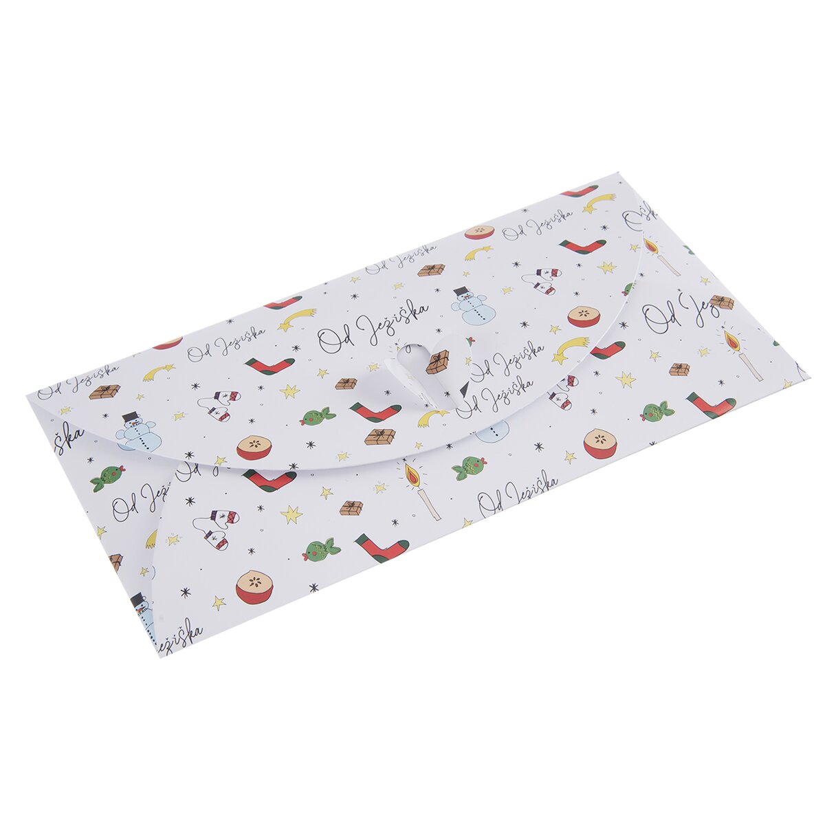 Kód produktu 842328Papierová obálka s dekorom a nápisom OD JEŽIŠKA, vo veľkosti 22x11 cm, je ideálna pre uloženie darčekového poukazu, financií aj rôznych voucherov.