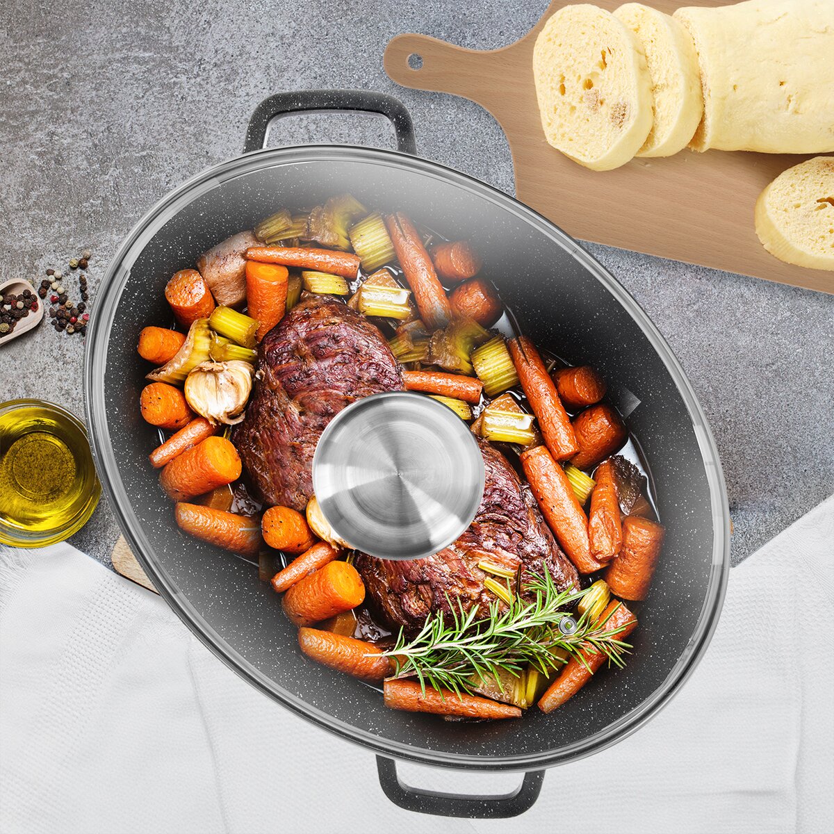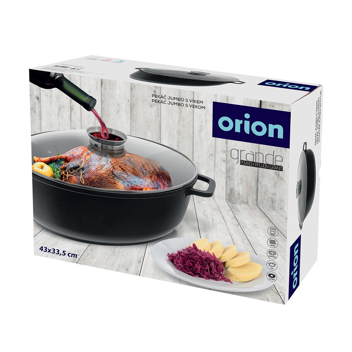 Pekáč s vnútorným rozmerom 42x32x13 cm je možné použiť ako klasický pekáč. Sklenená pokrievka s arómou úchytom umožní jemné dávkovanie tekutých dochucovadiel, olejov, vína a marinád.