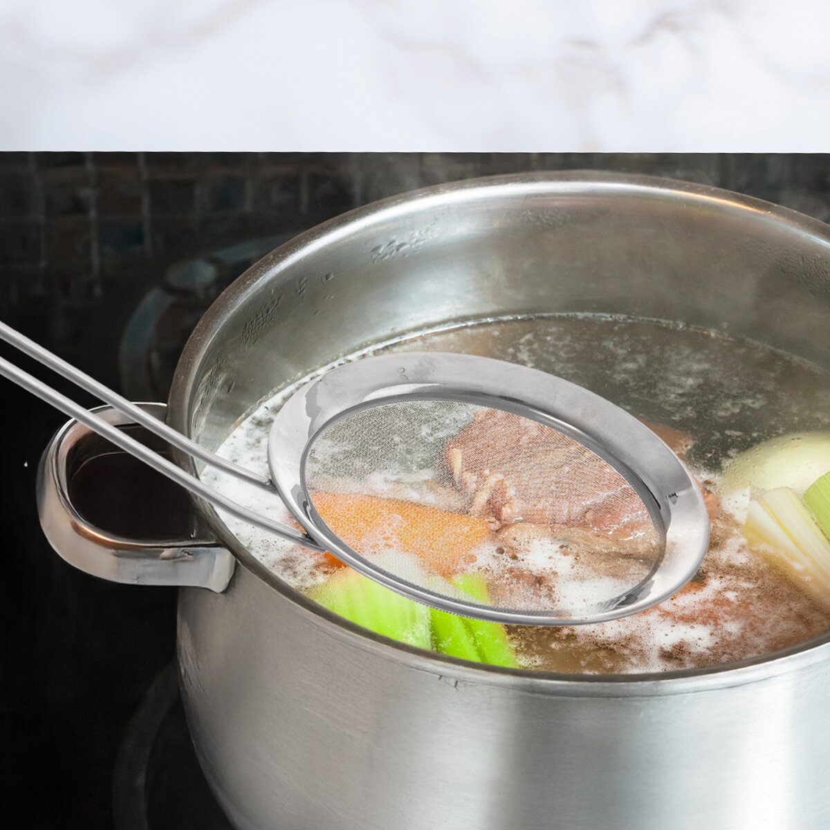 Veľmi jemné sitko má veľkosť ôk 0,45x0,45 mm. Umožňuje, aby tekutina odtekala, zatiaľ čo malé pevné časti zostanú v sitku. Vďaka dlhej rukoväti je bezpečné ju používať aj pri varení vo vriacej vode alebo vyprážaní v oleji.