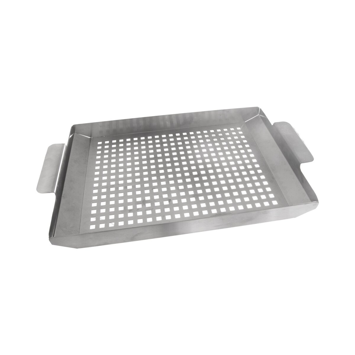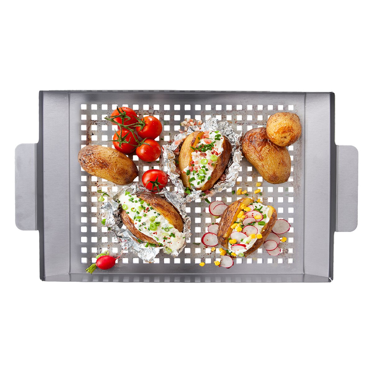Plech grilovací skvele využijete k príprave mäsa, rýb, špízov a ďalších pochutín na grile alebo v rúre. Mäso alebo špízy či ryby položíte na plech a umiestnite ich na gril alebo do rúry, môžete použiť i na priamy plameň. Pohodlne môžete obsah behom prípravy otáčať alebo odstaviť, pokiaľ by sa vám pokrm pripravoval rýchlejšie než zbytok jedla a neskôr dať späť na žiar grilu alebo do rúry. Plech je opatrený otvormi, cez ktoré preniká žiar. Vďaka dvom úchytom sa jednoducho prenáša – nutnosť použitia kuchynských chňapiek. Materiál: nerez. Jednoduchá údržba – je vhodný do umývačky na riad. Rozmery: 38,5/33,5x22,5x3/4 cm.