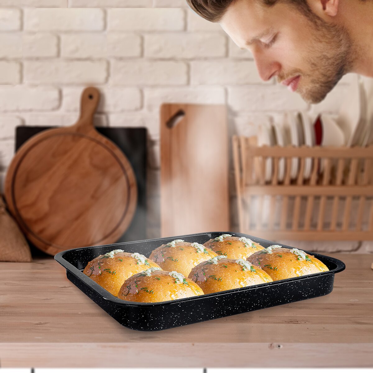 Tento plech je svojou veľkosťou 41,5x36,5 cm vhodný do bežných typov rúr, elektrických, plynových aj teplovzdušných, odolný smaltovaný povrch umožní zdravú prípravu vašich obľúbených jedál. Má zvýšený okraj, takže je vhodný aj na liate cestá.
