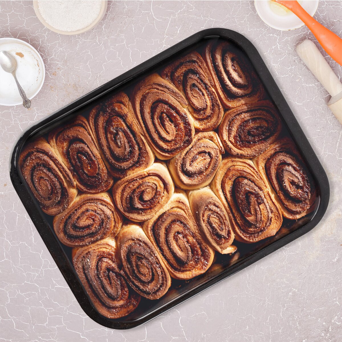 Vnútorný rozmer plechu je 32x26 cm, hrúbka plechu je 0,6 mm. A pokiaľ dôjde k pripečeniu, napr. keď vytečie náplň z jablčnej štrúdle, stačí ho nechať odmočiť, a potom vložiť do umývačky alebo umyť ručne.