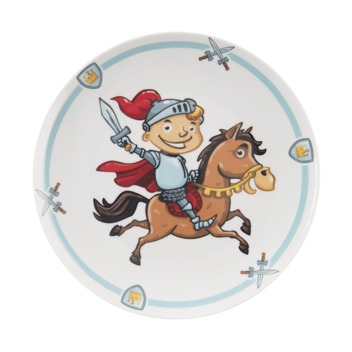 Kód produktu 128343Porcelánový plytký tanier s motívom rytiera na koni, s priemerom 21 cm, vhodný na servírovanie hlavného jedla i desiaty.