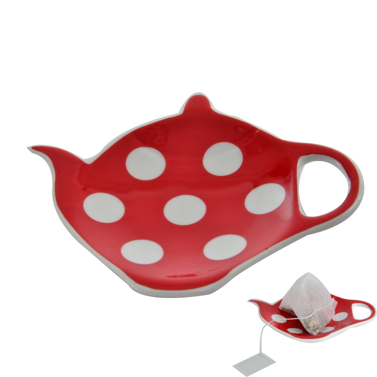 Kód produktu 125426Tácka v tvare kanvičky - podčajník na odloženie vylúhovaného čaju z hrnčeka. Materiál: porcelán. Dekór biele bodky. Rozmery: 11,5x9x1,5 cm.