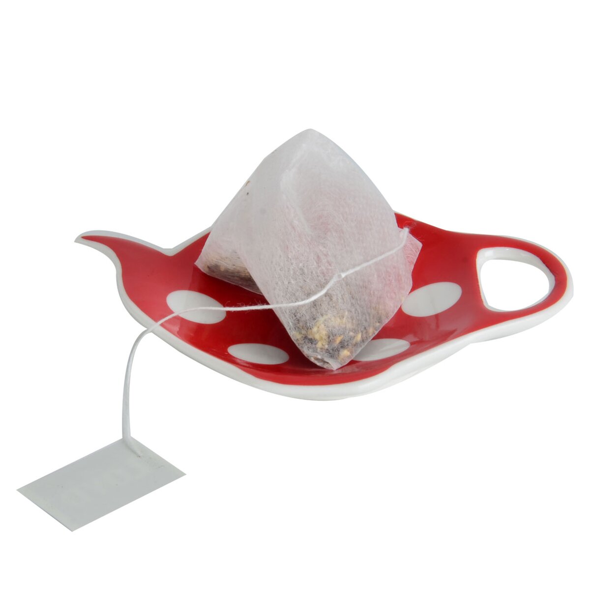Tácka v tvare kanvičky - podčajník na odloženie vylúhovaného čaju z hrnčeka. Materiál: porcelán. Dekór biele bodky. Rozmery: 11,5x9x1,5 cm.