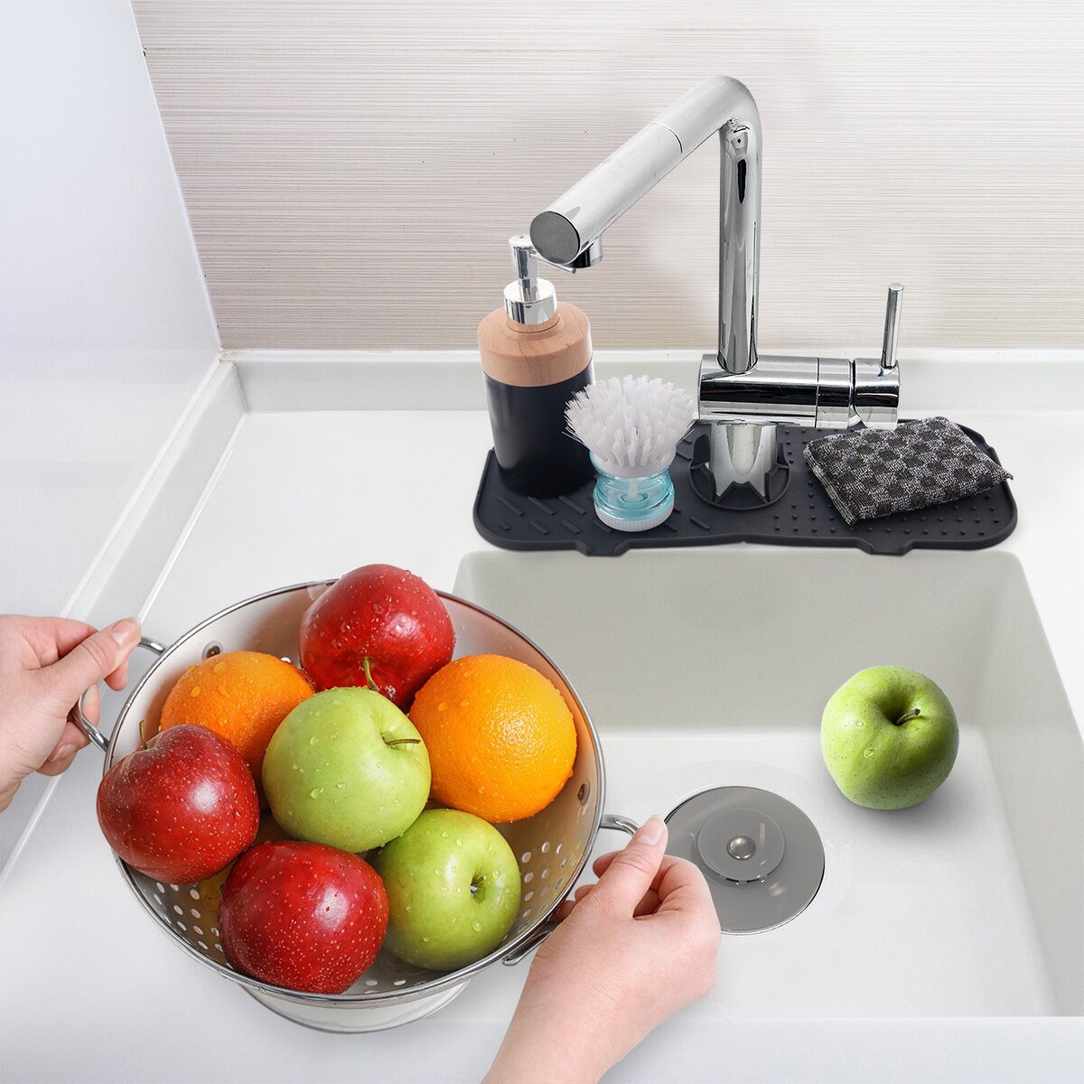 Jednoducho ju na mieste pridržiava vodná batéria, ktorou zovrie otvor uprostred podložky. Tvarované výpuste nasmerujú vodu tak, aby odtekala do umývadla/drezu.