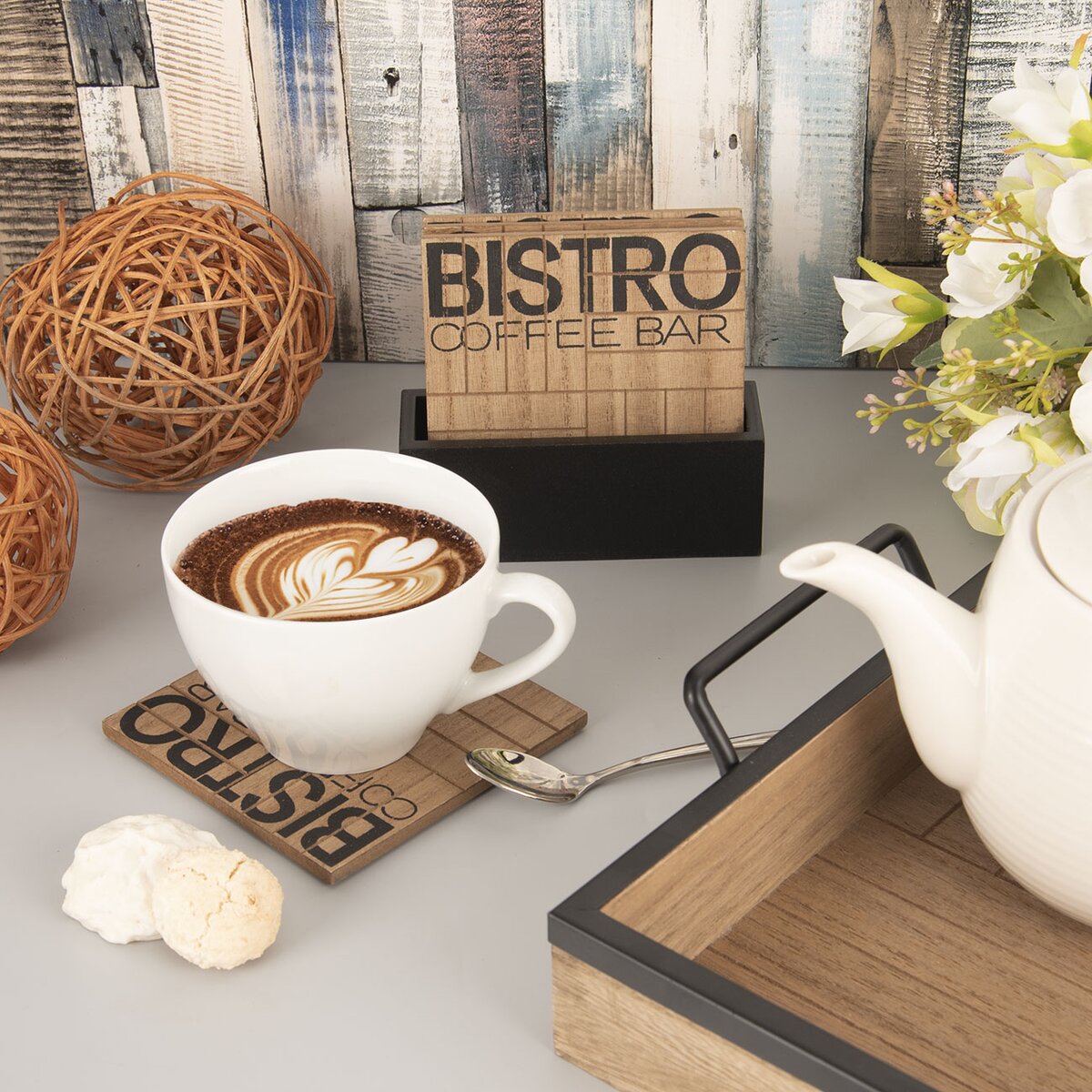 Kód produktu 710840Sada obsahujúca stojan a 4 podtácky Bistro v rozmere 10x10 cm, je určená na pokladanie hrnčekov, šálok a pohárov.
