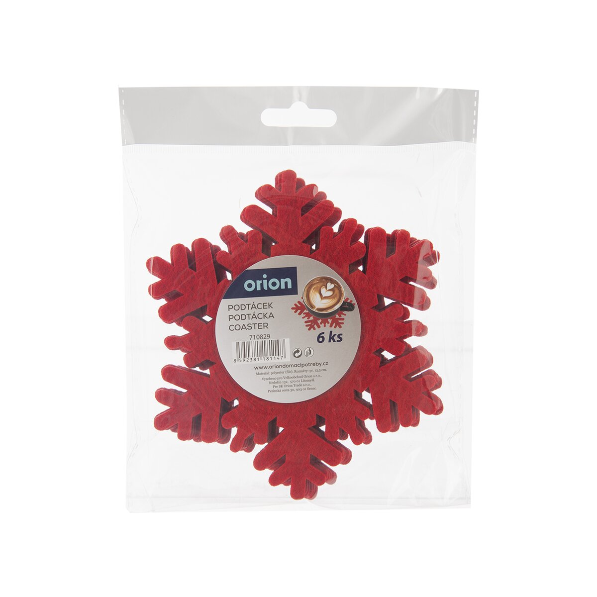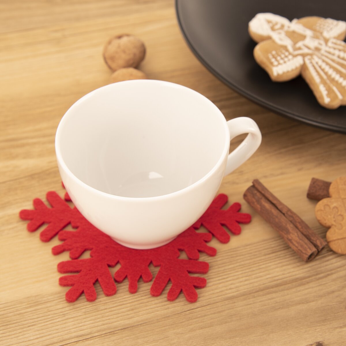Sada 6 kusov polyesterových podtácok v tvare červenej vločky zabráni vzniku nevzhľadných koliesok na kuchynskom, jedálenskom stole či konferenčnom stolíku. Či už si chcete vychutnať horúcu kávu, vianočný punč alebo osviežujúcu limonádu v orosených pohároch, nemusíte mať obavu z toho, že sa na vašom drevenom stole objavia nevzhľadné biele škvrny.
