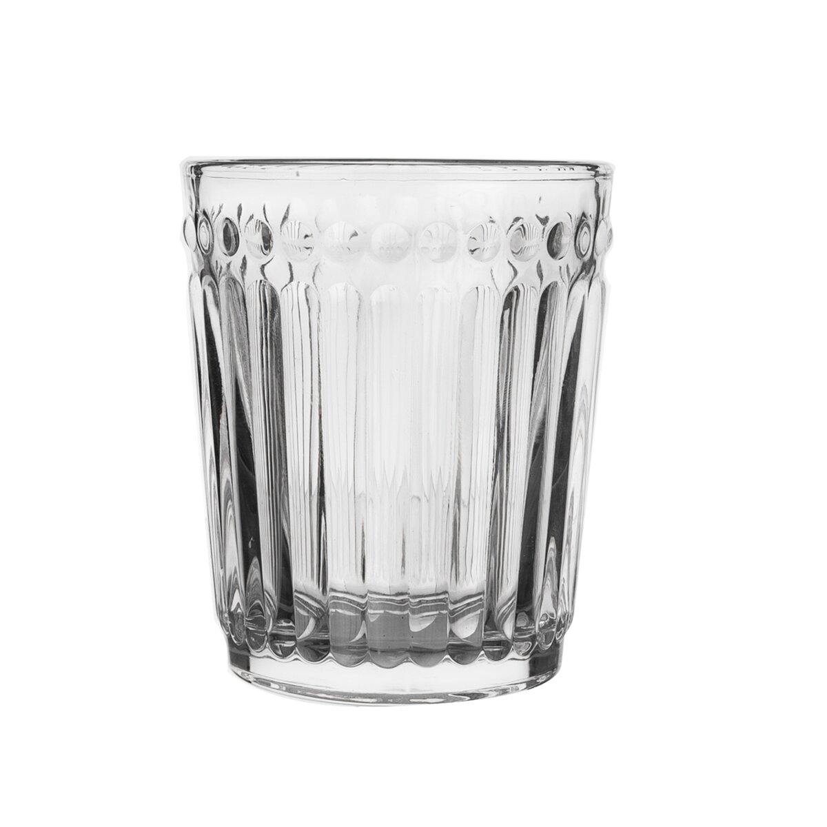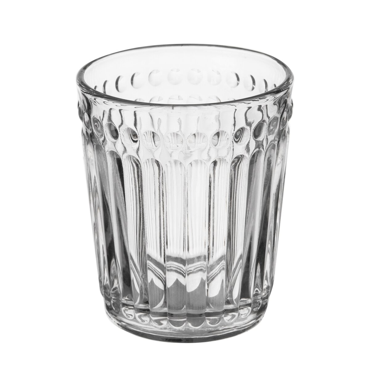 Kód produktu 127296Poháre s plastickým vzorom. Materiál: sklo. Rozmery: objem 0,32 l, pr. 8 cm, v. 10 cm.