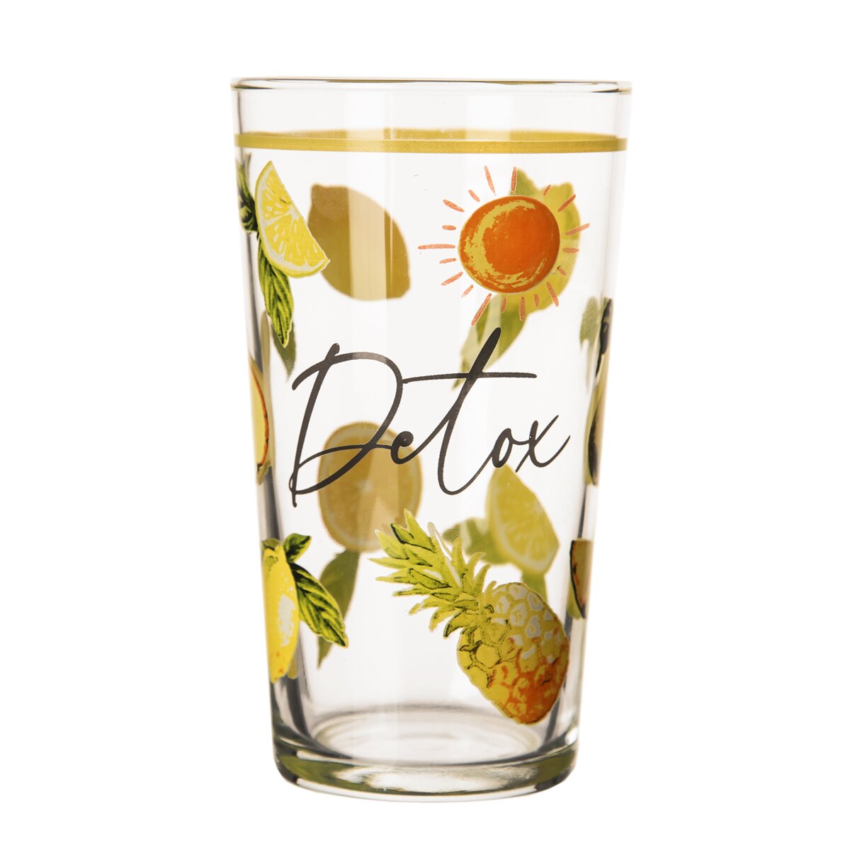 Kód produktu 129317Pohár s objemom 0,6 l s farebným dekorom citrónov, hrušiek a ananásu, vhodný nielen na letné nápoje a minerálky.
