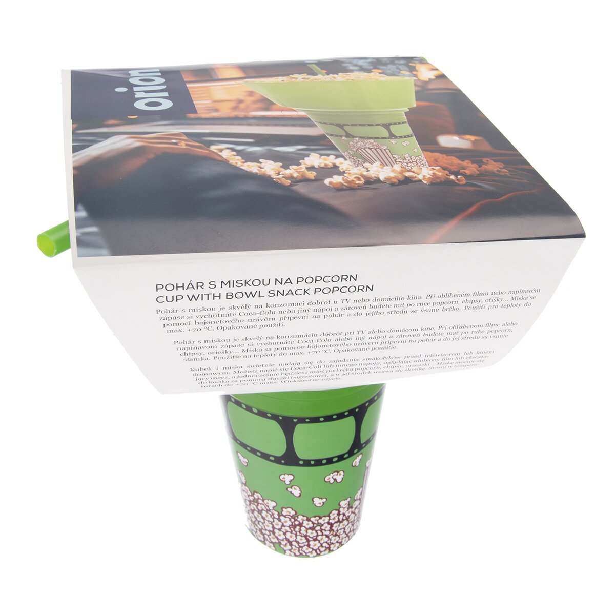 Do pohára stačí naliať nápoj, napr. colu alebo džús, uzavrieť miskou a do hornej misky nasypať popcorn, chipsy, oriešky alebo krekry. Do otvoru uprostred sa vsunie slamka a potom už môže premietanie začať. Budete si pripadať ako v kine.