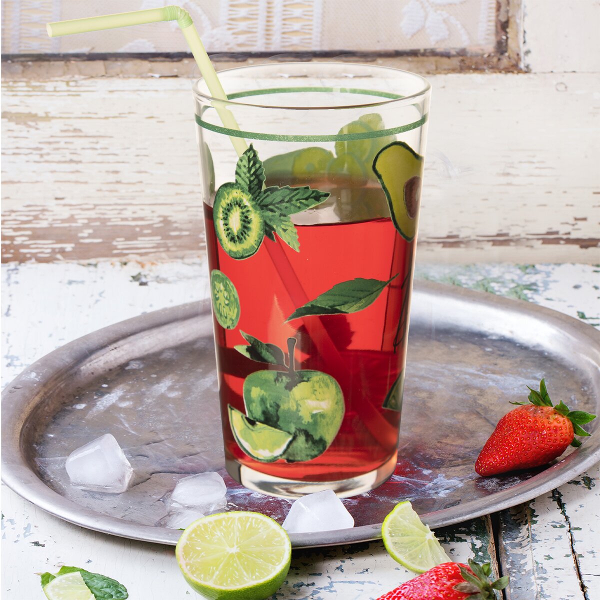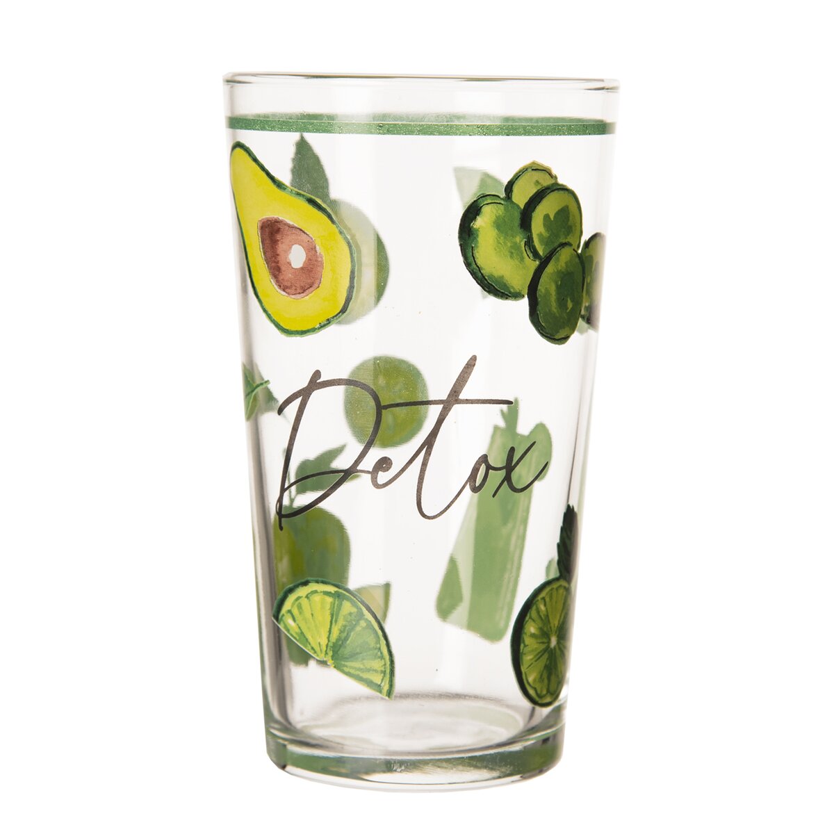 Kód produktu 129316Pohár s objemom 0,6 l s farebným dekórom zelených jabĺk, kivi, avokáda a uhoriek, vhodný nielen na letné nápoje a minerálky.