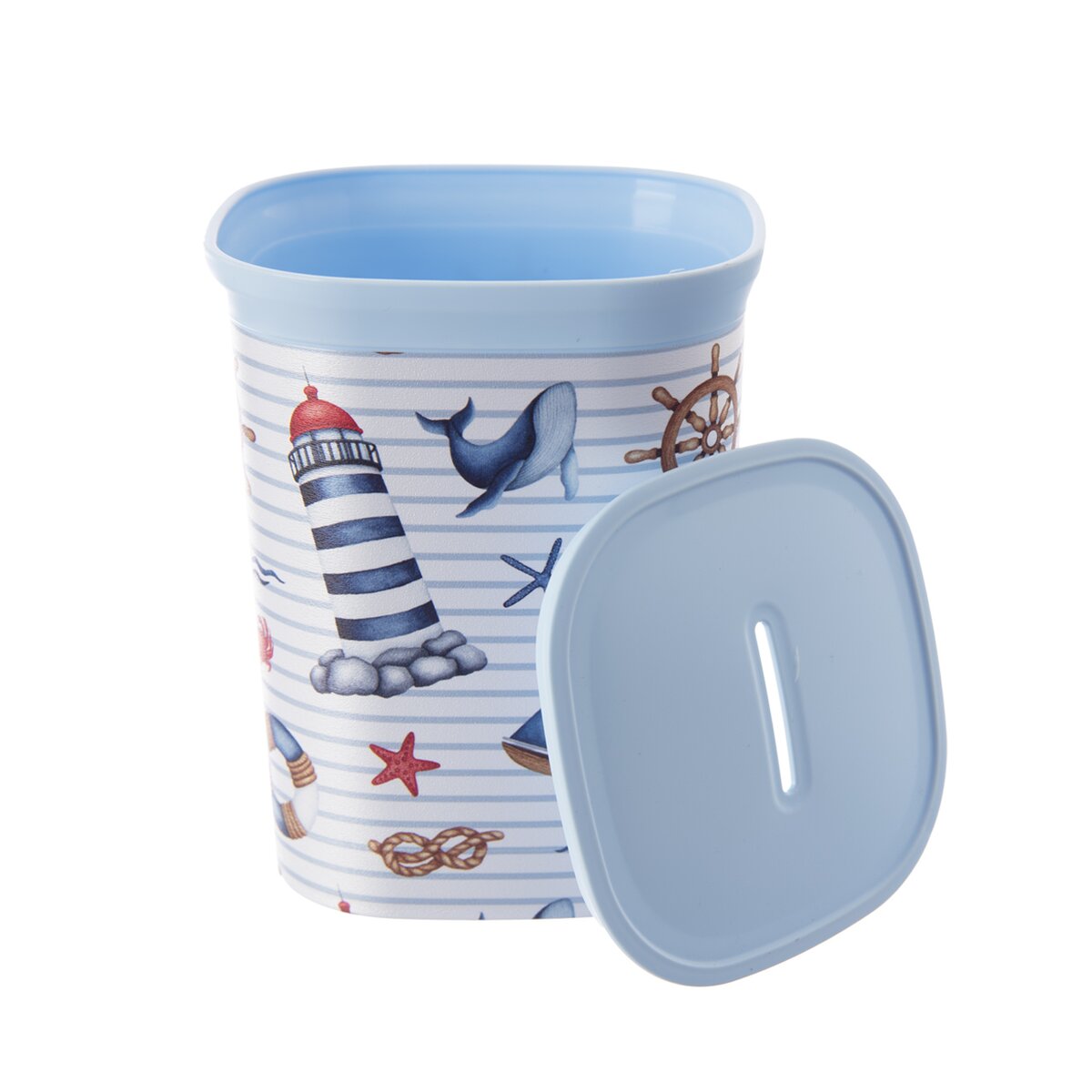 Kód produktu 822904Plastová pokladnička s námorníckym dekorom a svetlo modrým odnímateľným viečkom poslúži na ukladanie hotovosti.