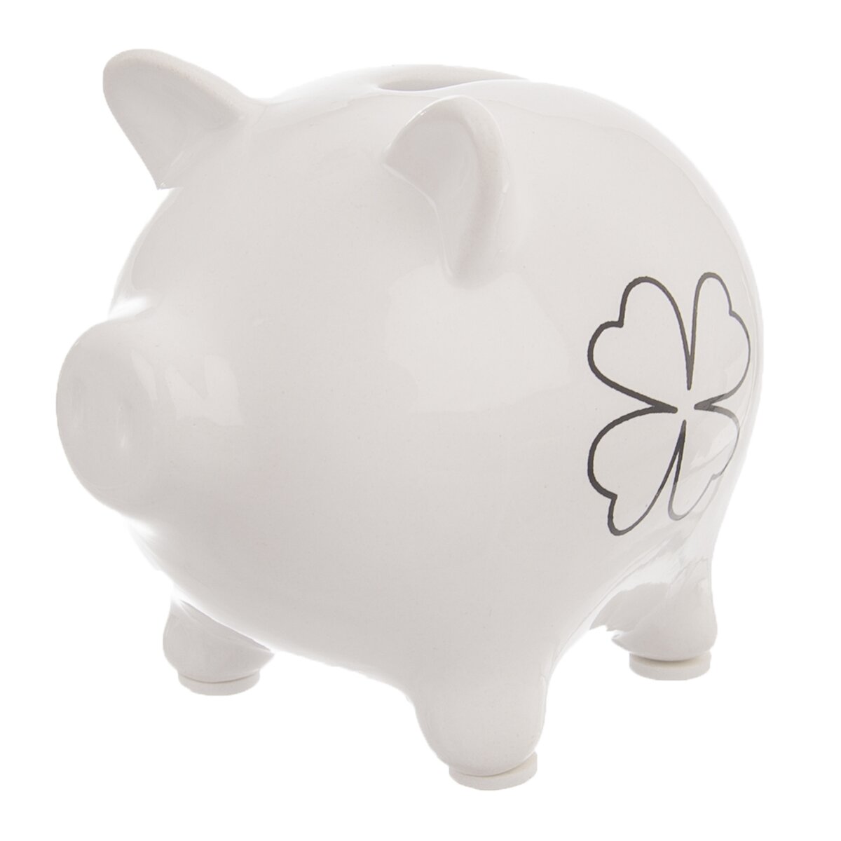 Kód produktu 821657Biela keramická pokladnička v tvare prasiatka s dekorom ŠTVORLÍSTOK. Jeho rozmery sú 9×7×7,5 cm.