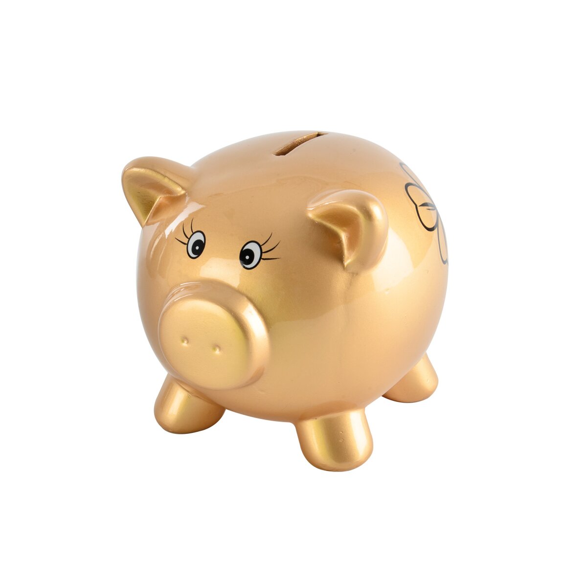 Kód produktu 821646Pokladnička PRASIATKO zlaté. Materiál: keramika. Otvor na vyprázdňovanie v spodnej časti pokladničky. Rozmery: 10x9x8,5 cm.
