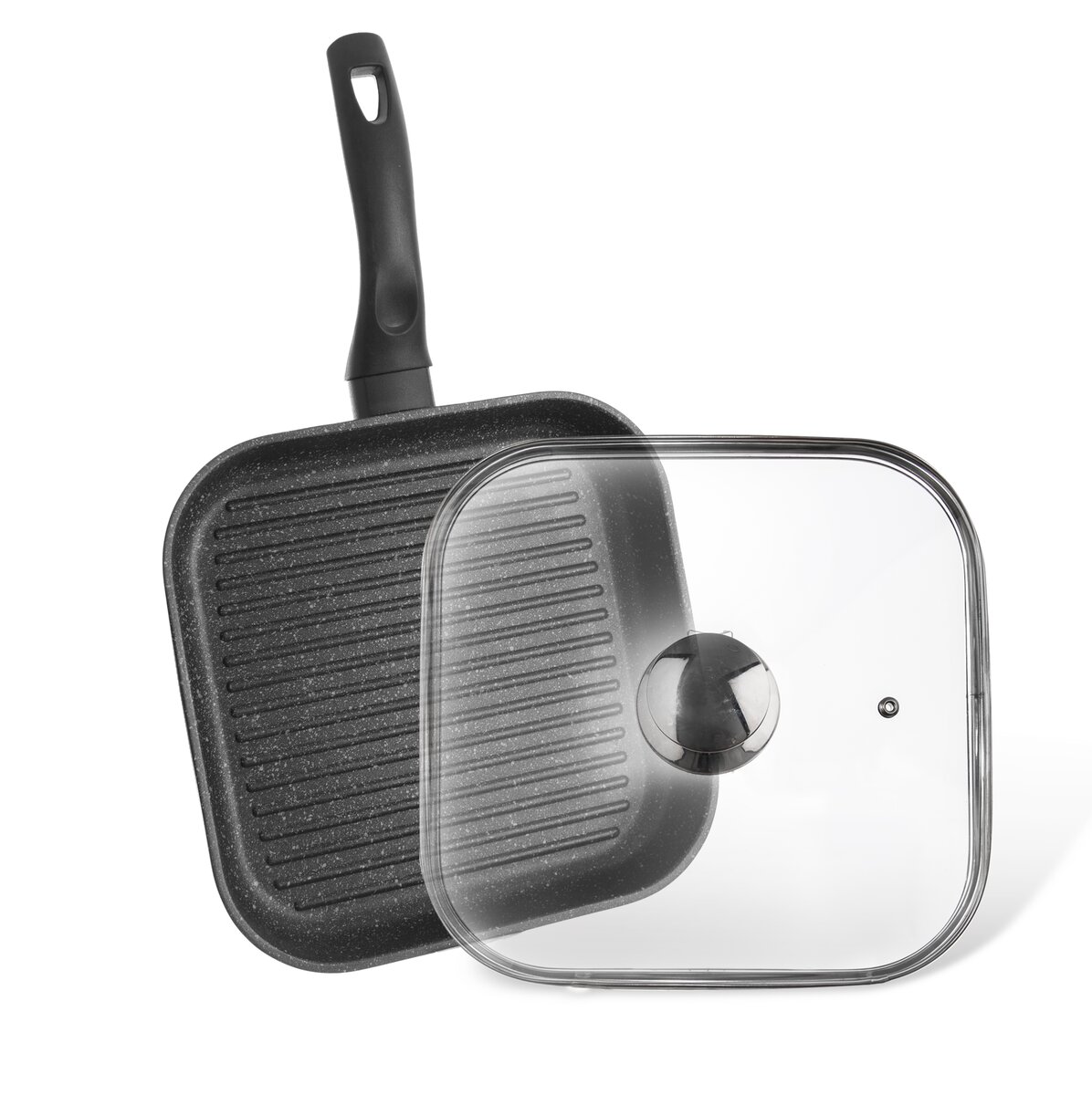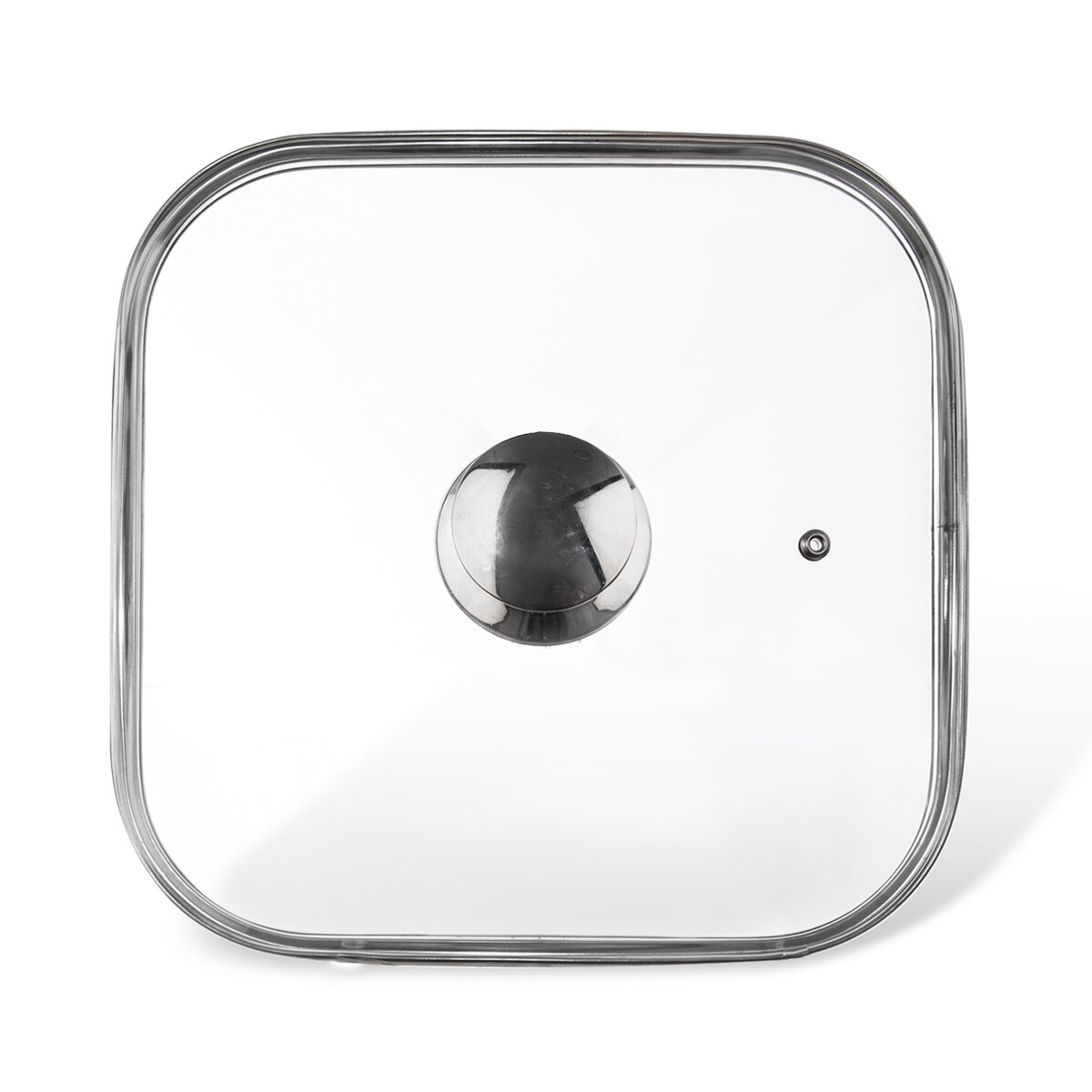 Praktická hranatá pokrievka s nerezovým úchytom a otvorem pro únik prebytočné pary umožní vizuálnu kontrolu nad stavem pripravovaného pokrmu.