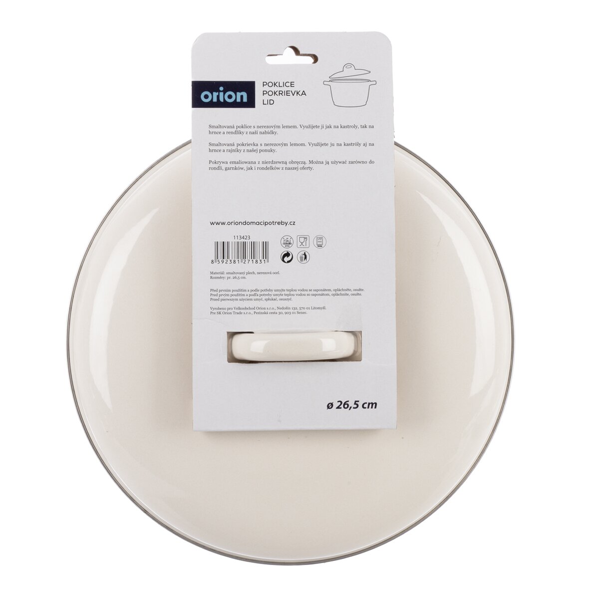 Kód produktu 113423Pokrievka smaltovaná s nerezovým lemom. Využijete ju na kastróly aj na hrnce (napr. na hrniec 113350). Materiál: smaltovaný plech, nerezová oceľ. Rozmery: pr. 26,5 cm. Nie je vhodná do mikrovlnnej rúry. Možno použiť v umývačke riadu a v rúre.