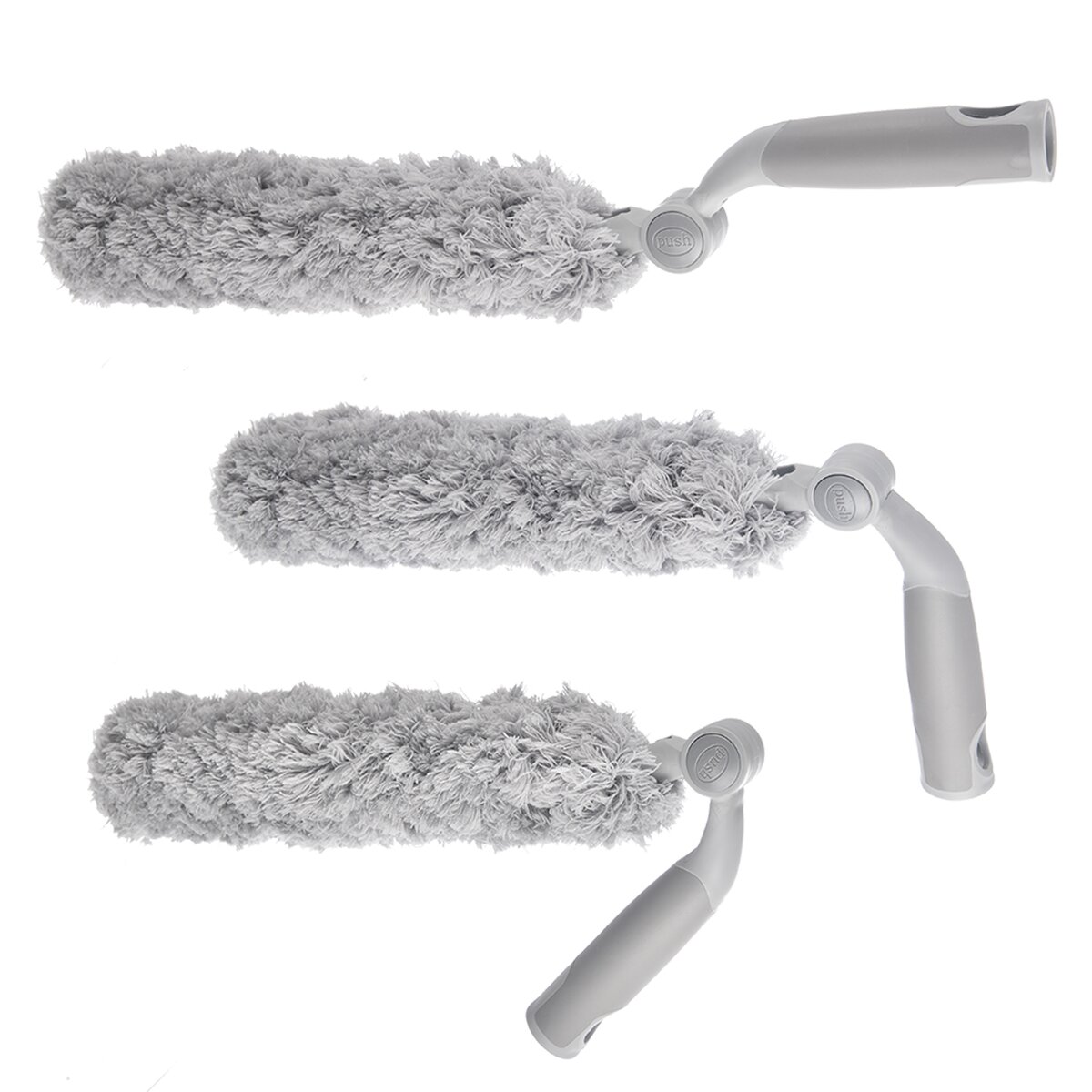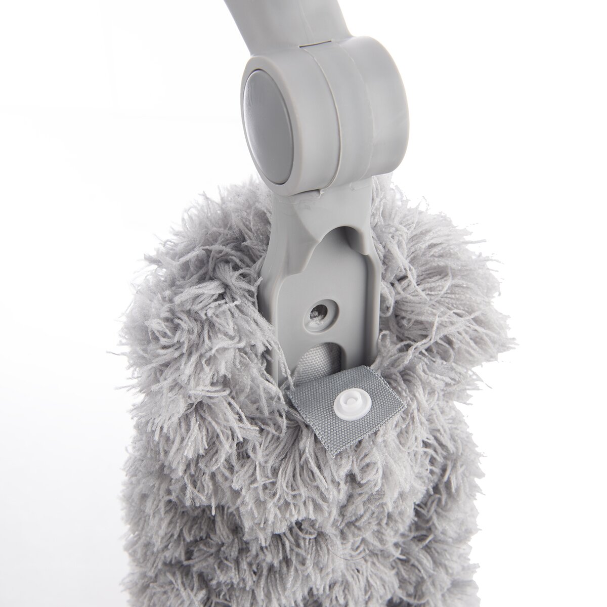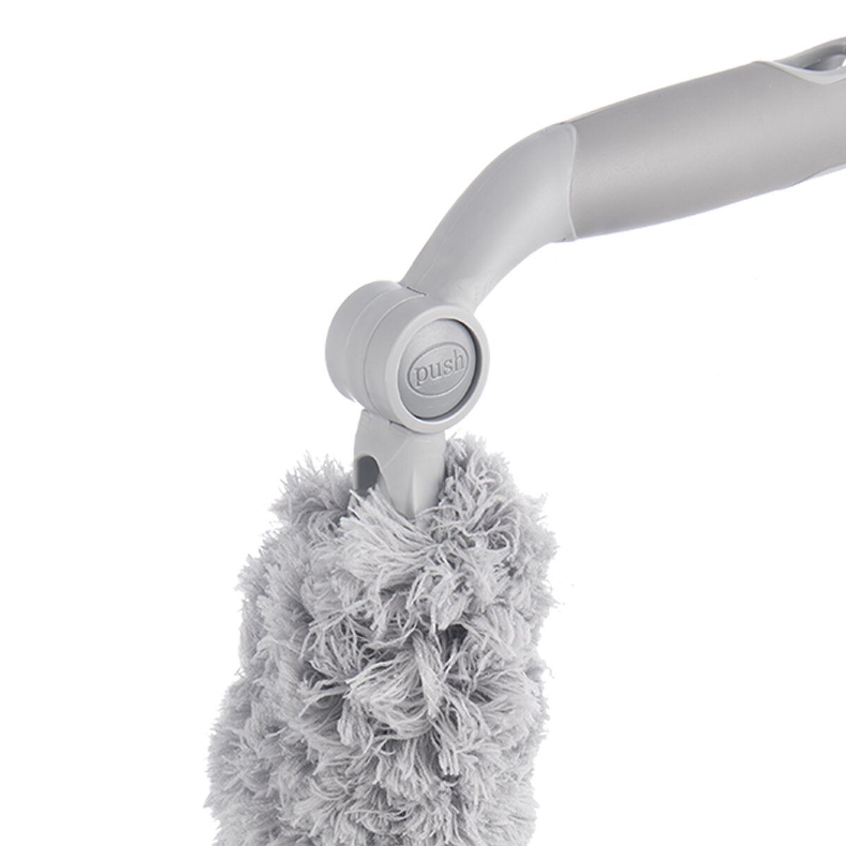 Prachovka z polyesteru a PP plastu vytvorí elektrostatický náboj a odstráni prach a drobné nečistoty z políc, skríň, regálov, komôd a pod. Zvlášť pri vyššom nábytku alebo garniže sa hodí jej variabilita. Stačí koncovku nacvaknúť na palicu, stlačením tlačidla v kĺbe jej rukoväte zvoliť uhol, ktorý potrebujete a prach a pavučiny odstrániť. To je označené PUSH, takže stačí z jednej strany zatlačiť a vybrať si z 5 polôh. Už žiadne ťahanie schodíkov, stupienku alebo stoličky.