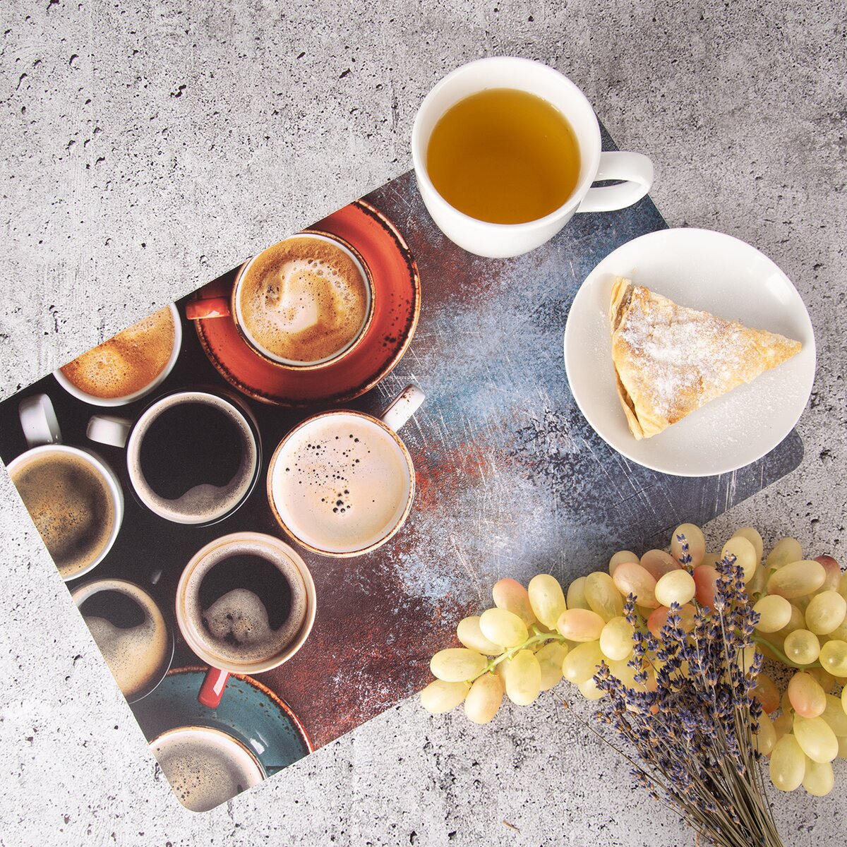 Tam, kde je interiér veľmi jednoduchý, toto výrazné prestieranie plné šálok s kávou dobre vynikne. Môže byť aj samostatnou podložkou pod dochucovacou, kávovou súpravou na jedálenskom stole alebo pod chlebníkom či kanvicou na kuchynskej linke.