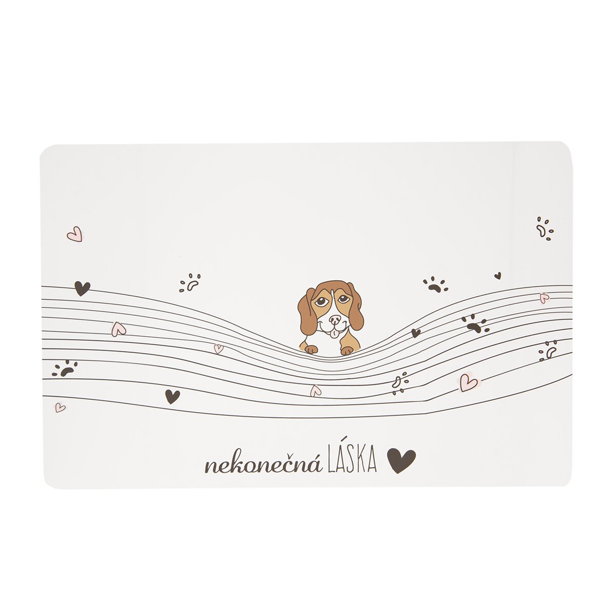 Kód produktu 728035Moderné prestieranie NEKONEČNÁ LÁSKA navodí príjemnú pohodu pri stolovaní. Jemný dekor liniek, labiek a vykukujúceho psíka je nielen pekný, ale doma či na terase toto prestieranie ochráni stôl pred zašpinením.