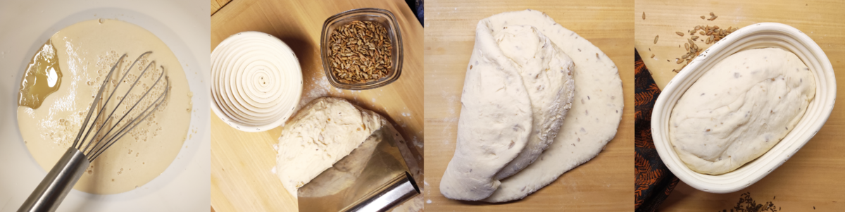 Príprava cesta je veľmi rýchla. Stačí v mise metličkou zmiešať vodu, cukor a droždie, až vznikne riedka kaša. Potom prilejeme olej, vsypeme preosiatu múku, semienka, soľ. Všetko ručným šľahačom, v robote alebo pekne ručne vareškou zapracujeme a necháme 20 minút kysnúť, prikryté pod utierkou.
