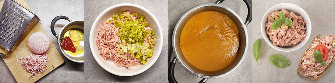 Na hrubom strúhadle nastrúhame salámu, nadrobno nakrájame uhorky a cibuľu. V rajnici sa zmieša olej, ocot, horčica, kečup a cukor a necháme všetko krátko povariť, aby sa chute prepojili. Prilejeme do misy k saláme, uhorke a cibuľke a premiešame. Po vychladení v chladničke pridáme k nátierke ešte majonézu, ktorá všetko pekne spojí a je to.