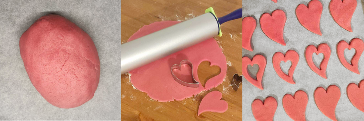 Vyvaľkajte plát s hrúbkou 2 mm, výborne sa osvedčil valček s nastaviteľnými bokmi, ktorý ľahko pomúčite. Vykrajujte tvary srdiečok a položte ho na plech, pri polovici prekrojte stred menšou vykrajovačkou. Možno použiť papier na pečenie, ale cesto je vďaka maslu mastné, tak to je skôr kvôli tomu, aby ste si uľahčili umývanie plechu. Pečte vo vyhriatej rúre na 170 °C 10-12 minút, hore bude pečivo pekne ružové, zo spodnej strany ľahko hnedé. Toto množstvo vyjde na cca 2 plechy.