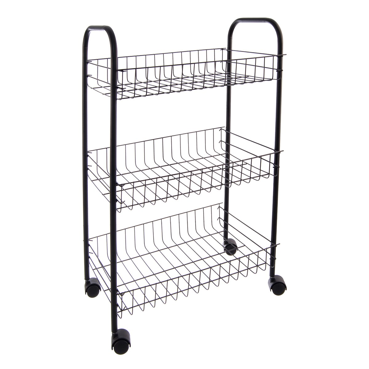 Kovový regál s tromi drôtenými košíkmi v celkovom rozmere 40,5x24x63 cm bude skvelým odkladacím miestom aj v menšej kuchyni, kam je možné uložiť dochucovadlá, utierky. V pracovni a dielni nájde využitie pre boxy s pracovnými, písacími potrebami. Ale aj na terase alebo balkóne budete mať vďaka možnosti pojazdu po ruke všetko potrebné.